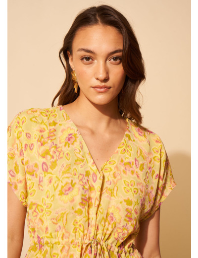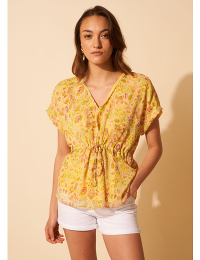 Très tendance ce top. Avec son col V et ses manches courtes à épaules tombantes le TWILLY est "loose". Il peut se resserrer à la taille. Il se distingue par son imprimé de couleurs vives dans les tons anis.