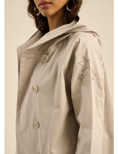 Le trench VACKYA est doté d'une capuche offre un style fonctionnel et tendance avec son boutonnage frontal et ses deux poches plaquées sur le devant. Il se distingue par ses étoiles brodées en gros fil sur la manche gauche. Portez-le au dessus d'un ensemble casual comme un jean et un tee-shirt blanc.