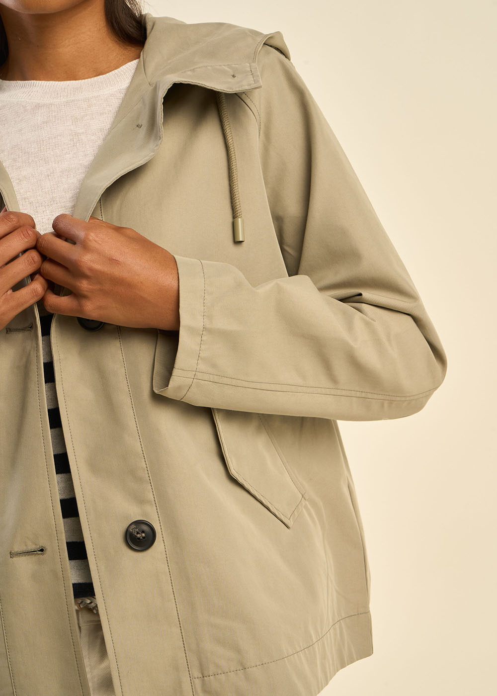 Le trench court VODIMA est idéal pour affronter les journées pluvieuses avec style. Son design pratique et décontracté en fait une pièce incontournable pour la mi-saison.