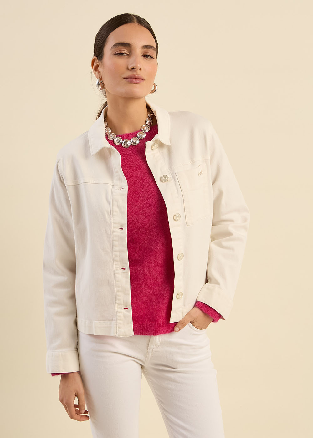 La veste VIOLINE revisite le style workwear avec des détails soignés et une coupe moderne. Son col chemise et son ouverture milieu devant, fermée par des boutons jaspet, lui confèrent une allure intemporelle. Une découpe subtile à la carrure structure la silhouette, tandis que les poches plaquées à rabats boutonnés ajoutent à la fois style et fonctionnalité. Les poignets boutonnés offrent une finition élégante, et les trois petites étoiles brodées sur la poche apportent une touche distinctive.