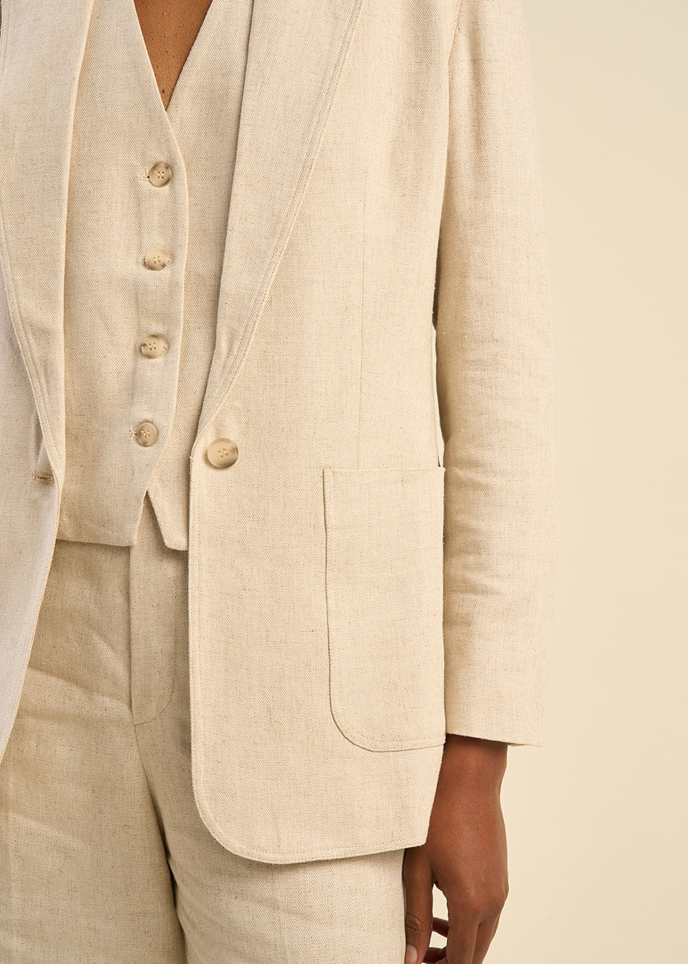 La veste VASTALI se caractérise par sa coupe élégante de tailleur agrémentée de pinces sur la poitrine et de poches plaquées à l'avant. Optez pour le total look, en associant la veste VASTALI au délicat gilet sans manches GASTALI et au