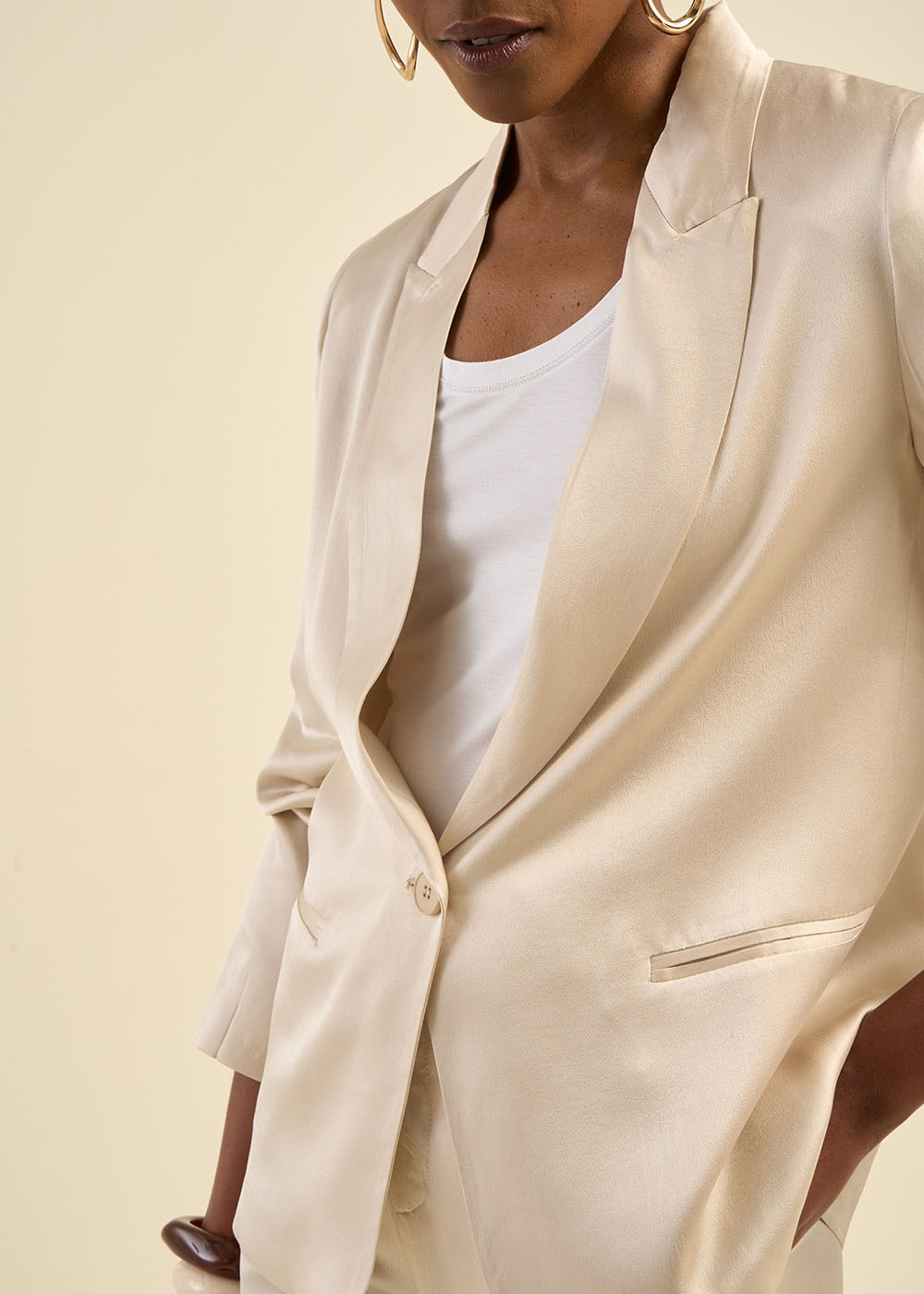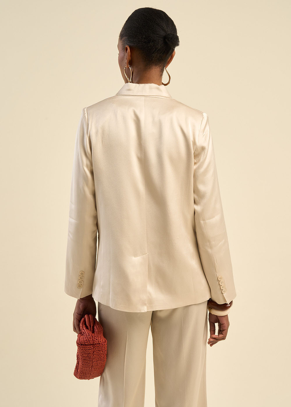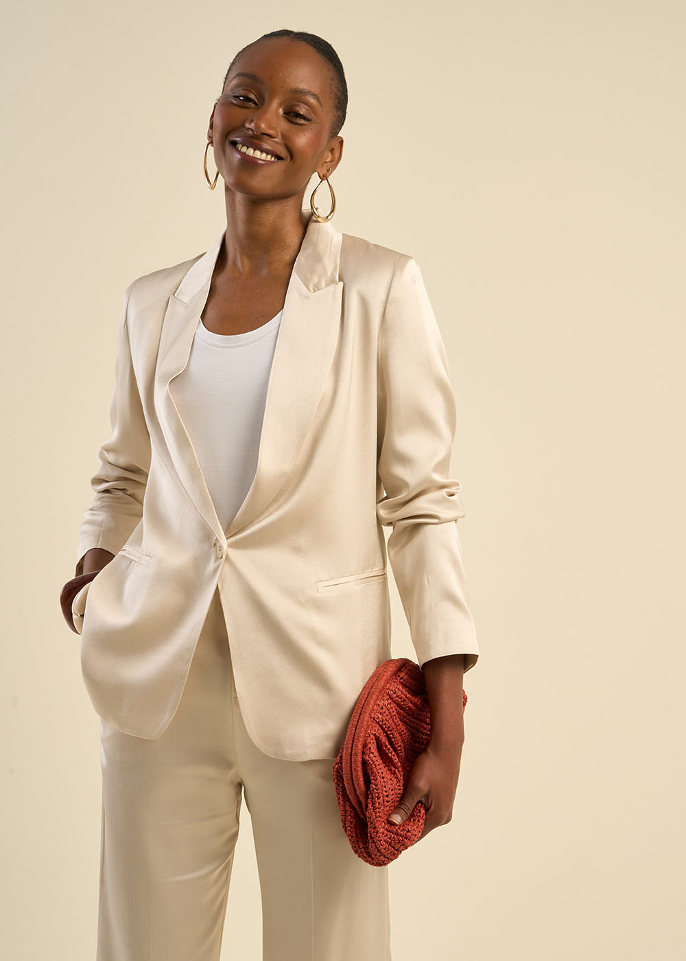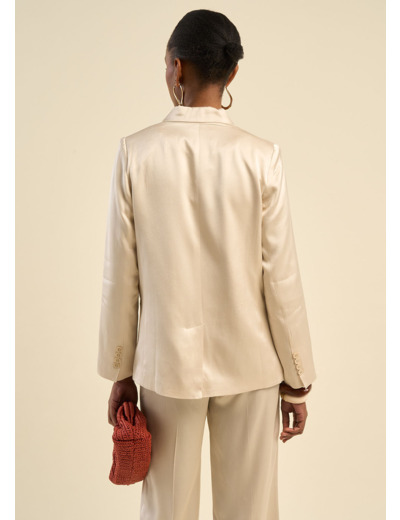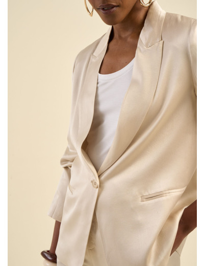 La veste VATINY, en satin fluide et raffiné, est l’incarnation du chic moderne. Sa coupe droite et son tissu élégant en 100 % viscose en font une pièce idéale pour les tenues habillées. Portée avec le pantalon PATY, elle compose un ensemble sophistiqué, tandis qu'associée à un pantalon large, elle crée une silhouette fluide et tendance. Entièrement doublée et dotée d’une fente discrète au dos, elle allie confort et élégance pour s’adapter à toutes les occasions.