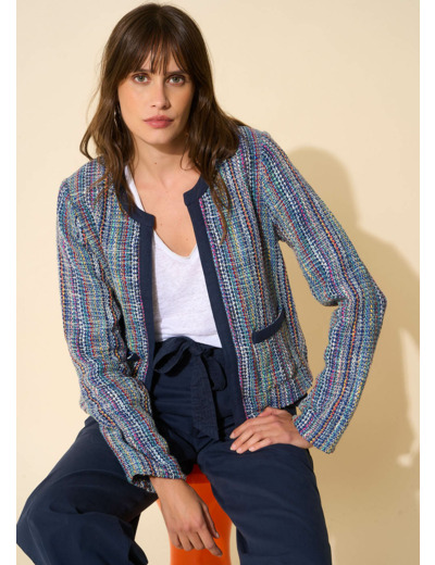 La veste VAHALA est remarquable pour son tweed multicolore délicat. Elle est équipée de manches longues, de poches plaquées à l'avant et de finitions ornées de galons à l'encolure, au centre et sur l'ouverture. Associez-la à une chemise blanche légère pour un look parfaitement assorti.