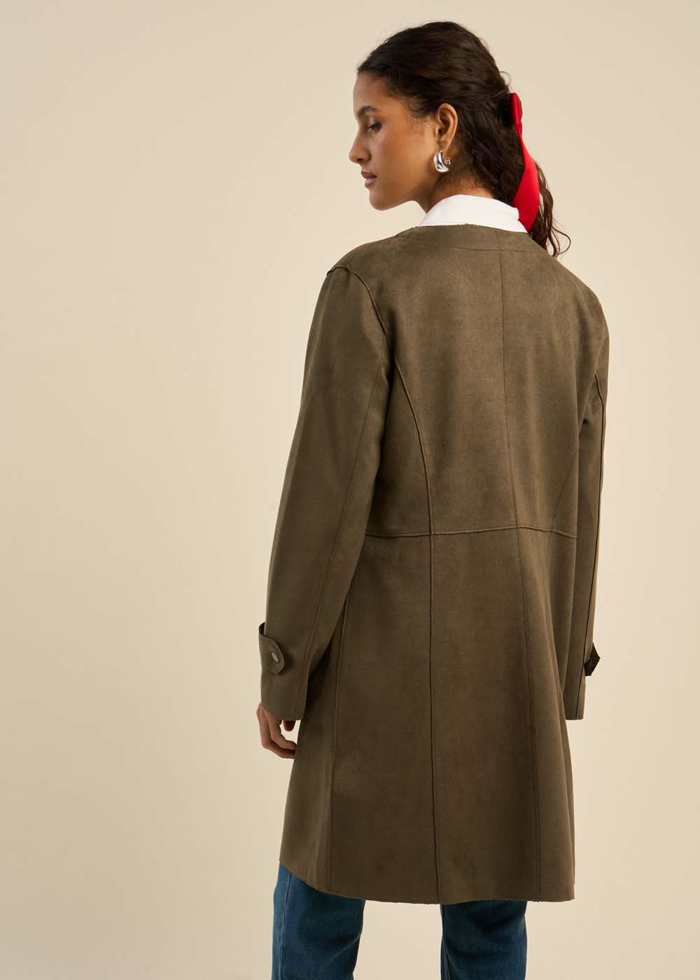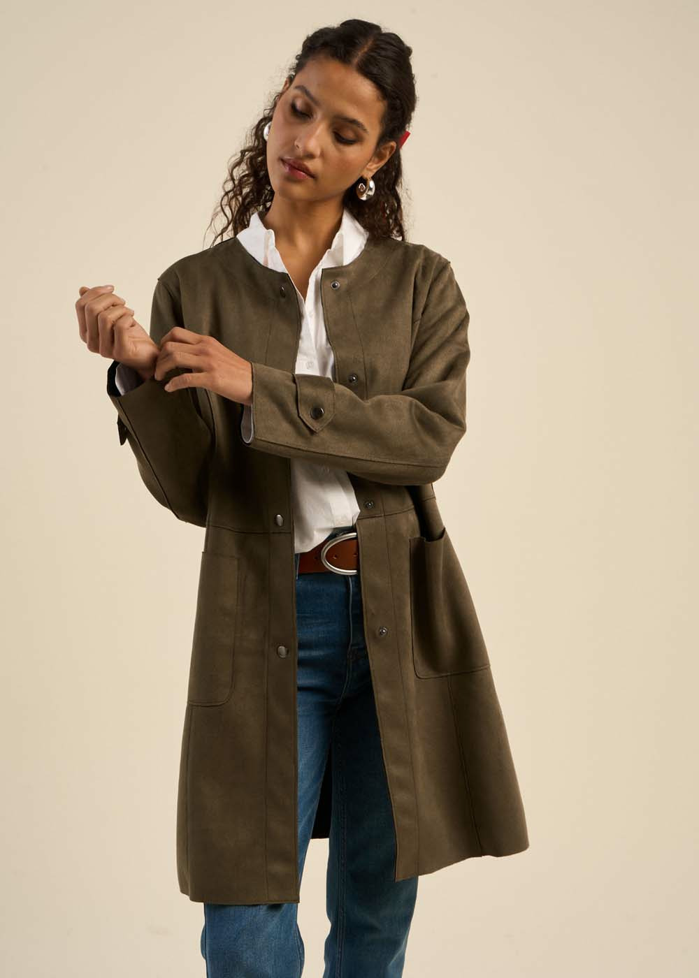 Apportez une touche de sophistication à votre garde-robe avec la veste VALBANE. Sa coupe longue et ajustée, effleurant élégamment les genoux, met en valeur votre silhouette avec féminité. Confectionnée en faux daim doux, elle se distingue par ses boutons pression modernes et ses découpes princesses qui sculptent délicatement la poitrine. Les deux grandes poches plaquées ajoutent une note pratique et chic, tandis que le jeu de finition bord franc apporte une touche de caractère. Parfaite pour ajouter de l'élégance à vos looks, cette veste s’adapte aussi bien à vos tenues de jour qu’à vos ensembles plus habillés.