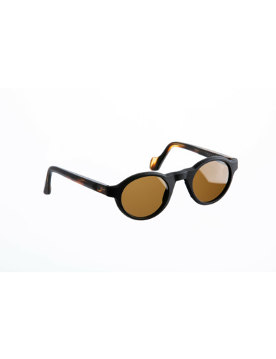 Face en frittage de polyamide noir, branches en acétate écaille foncé, charnière flex. Verres minéraux brun gravés “Brunetti” avec traitement anti-reflet interne. Protection UV catégorie 3. Monture résistante aux chocs, verres très résistants aux rayures. Fabrication française, matériaux durables, production locale à Nantes.