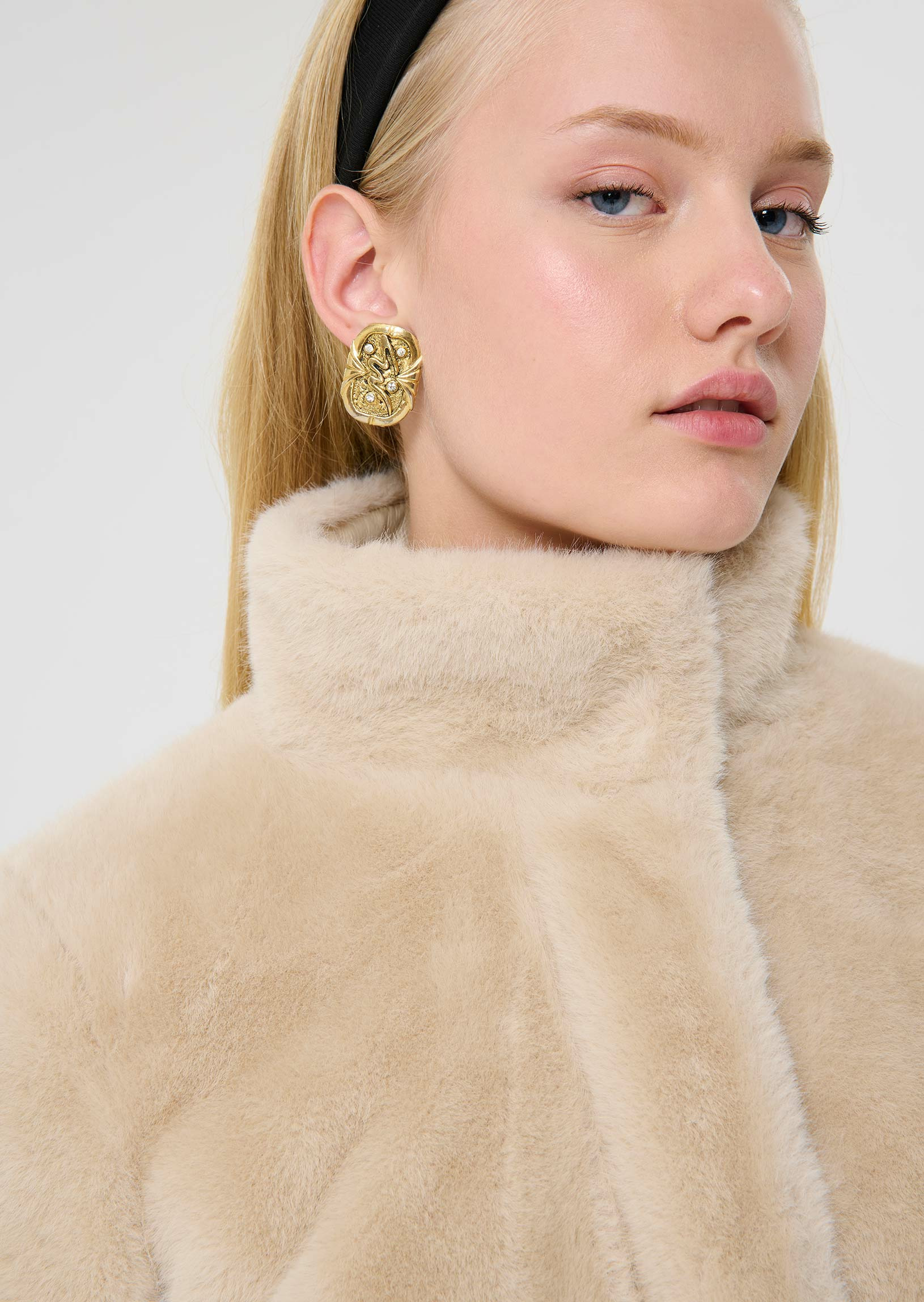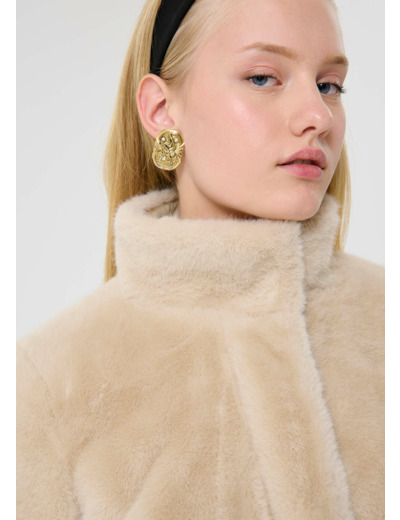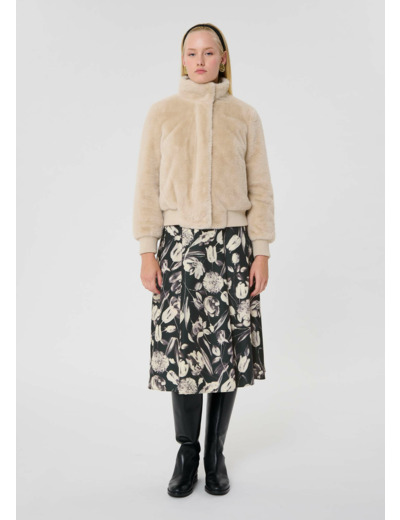 Ce court blouson couleur craie en fausse fourrure possède un col montant et des manches longues elastiquées aux poignets. Il se ferme au devant par un zip dissimulé.