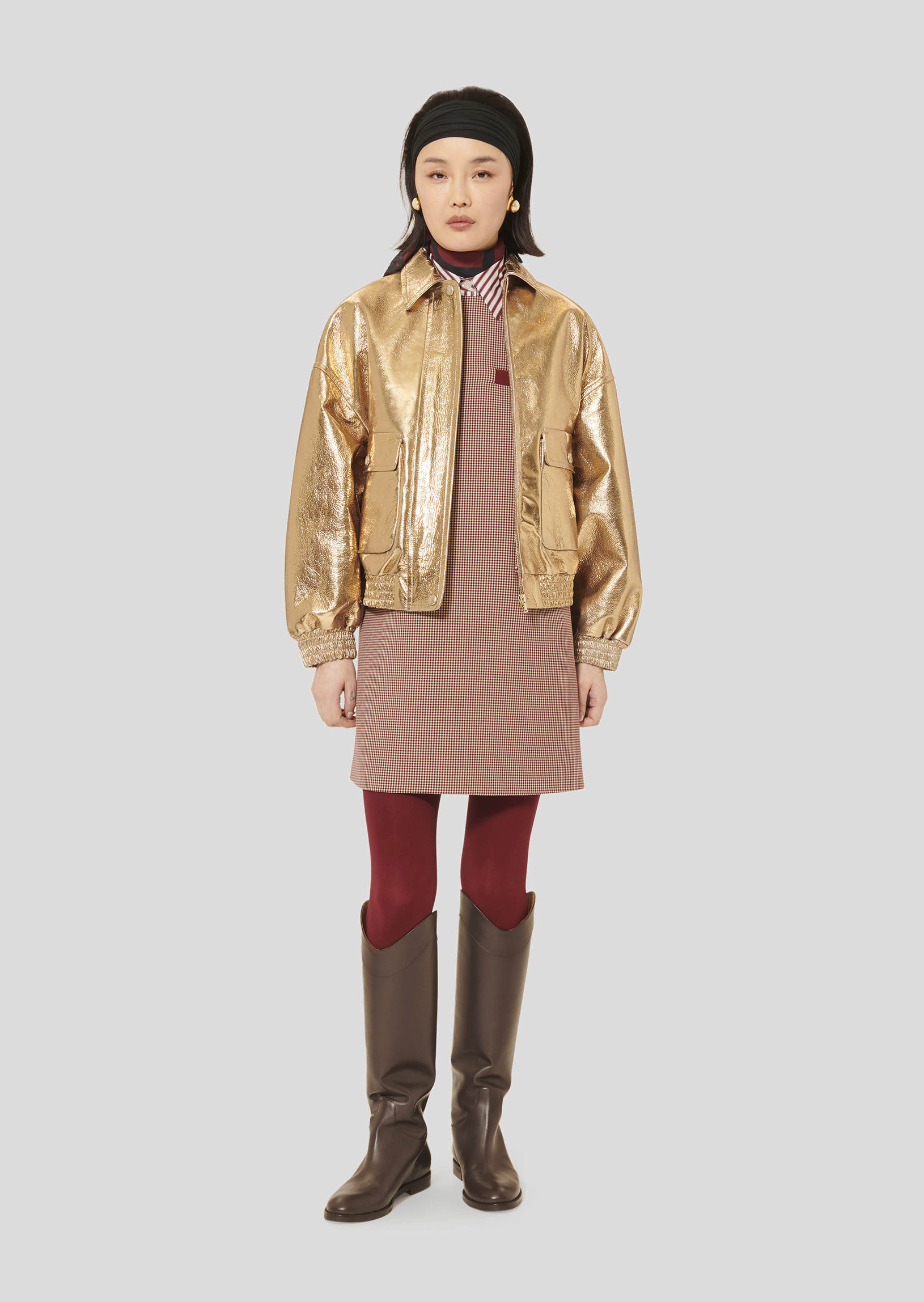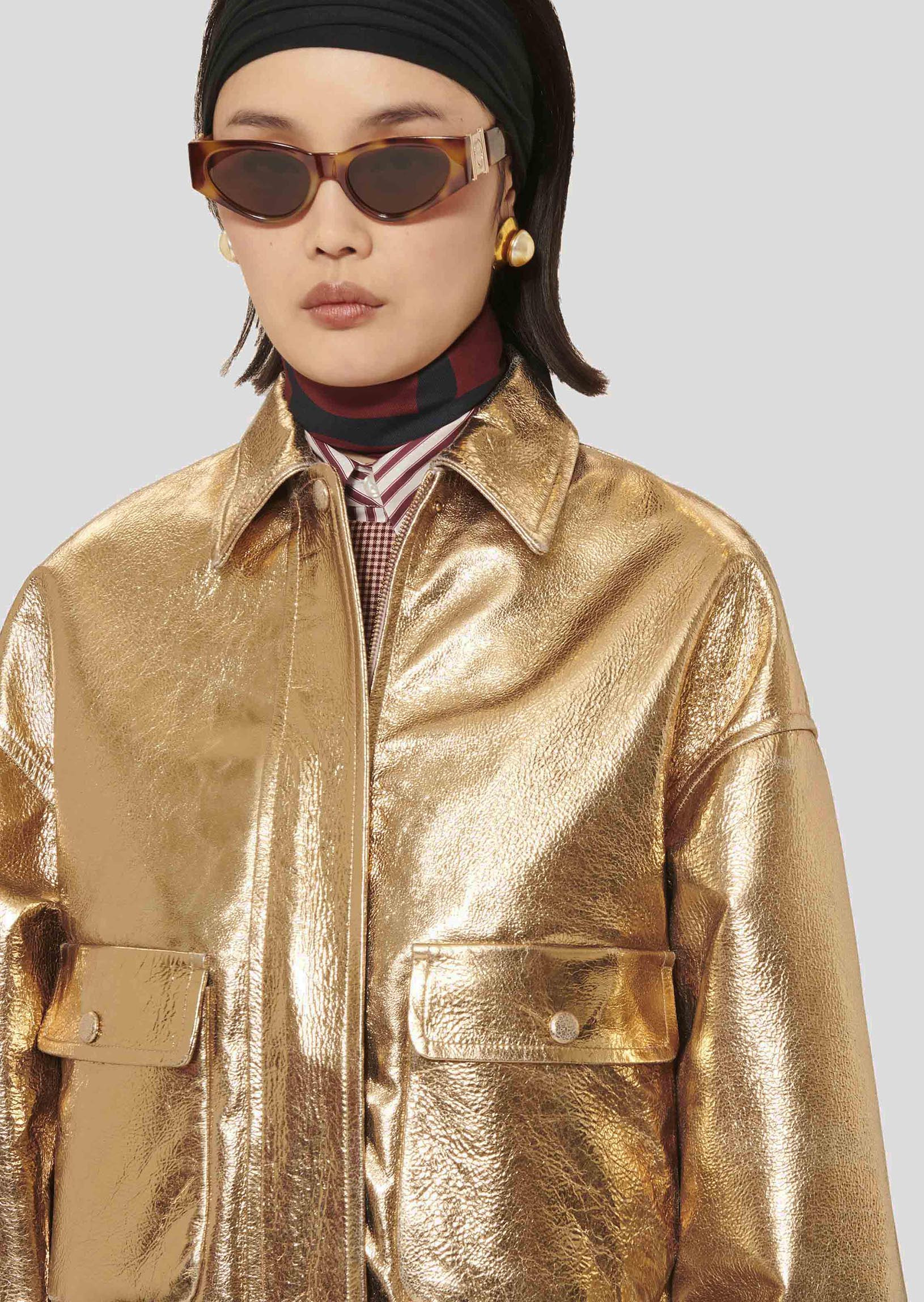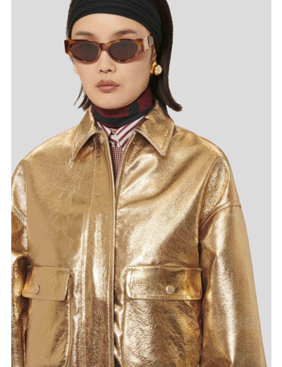 Ce blouson doré en cuir à l'esprit bomber avec sa taille et ses poignets élastiqués possède une coupe courte et légèrement oversized, un col chemise et deux grandes poches à rabats aux côtés. Il se ferme au-devant par un zip et des boutons pression ton sur ton.