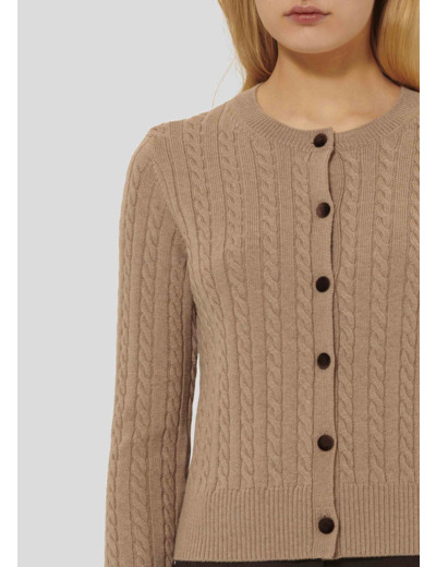 Ce cardigan couleur noisette en laine tressée possède une encolure ronde et des manches longues. De larges bords-côtes marquent le bas, l'encolure et les poignets. Il se ferme au-devant par des boutons marron.