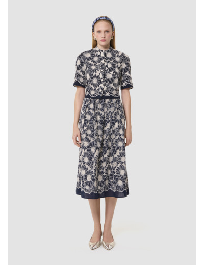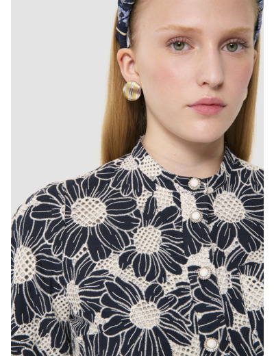 Cette chemise bleu nuit courte en broderie anglaise possède un col officier et des manches courtes. Elle a une poche plaquée au niveau de la poitrine et elle se ferme au devant par des boutons bijoux. La touche so Tara, sa broderie anglaise ultra romantique formant de grosses fleurs. Optez pour le total look avec la jupe Junio assortie.