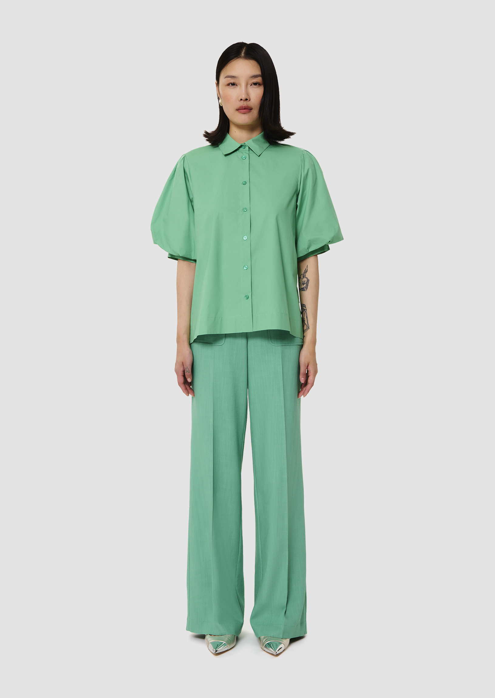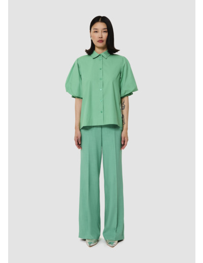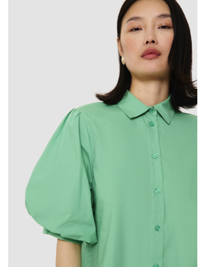 Cette chemise couleur vert pistache en popeline possède un col chemise et des manches courtes bouffantes. Elle a une coupe légèrement évasée et se ferme au devant par de petits boutons verts que l'on retrouve également aux extrémités des manches.