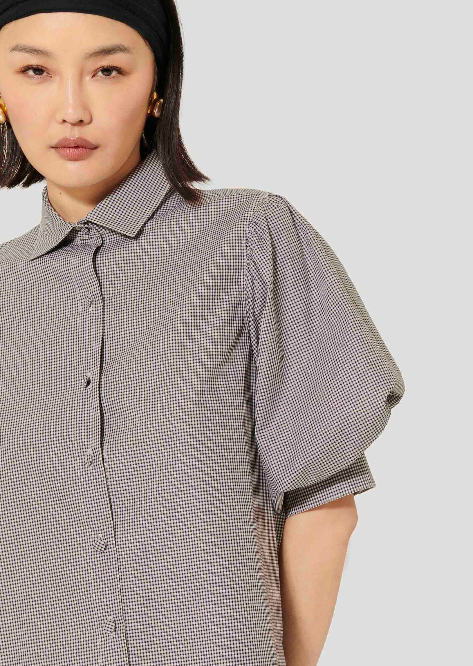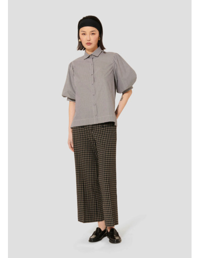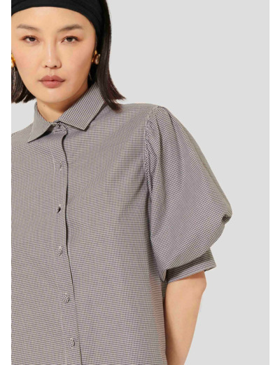 Cette chemise noire en vichy en popeline possède un col chemise et des manches courtes bouffantes. Elle a une coupe légèrement évasée et se ferme au-devant par des petits boutons recouverts ton sur ton que l'on retrouve également aux extrémités des manches.