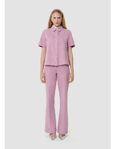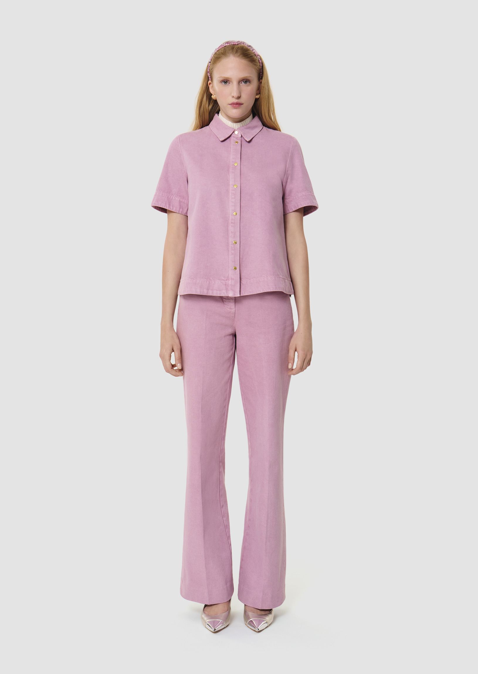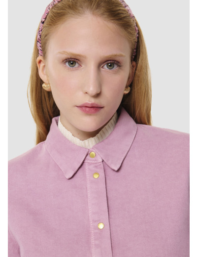 Cette chemise couleur vieux rose en denim léger possède un col chemise classique et des manches courtes. Elle a une coupe courte légèrement évasée et se ferme au devant par de petits boutons pressions dorés. Idéale à porter avec le pantalon Jerome assorti pour un total look denim.