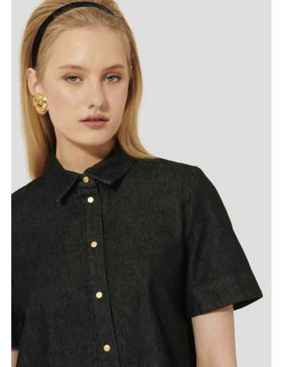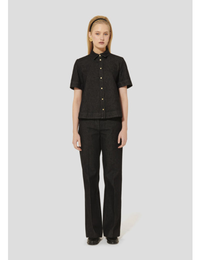 Cette chemise noire en denim léger possède un col chemise classique et des manches courtes. Elle a une coupe courte légèrement évasée et se ferme au-devant par de petits boutons pressions dorés. Idéale à porter avec le pantalon Jerome assorti pour un total look denim.