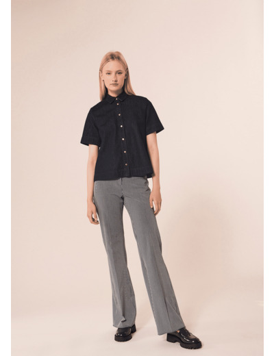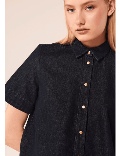 Cette chemise bleu marine en denim léger possède un col chemise classique et des manches courtes. Elle a une coupe courte légèrement évasée et se ferme au devant par de petits boutons pressions dorés. Idéale à porter avec le pantalon Jerome assorti pour un total look denim.