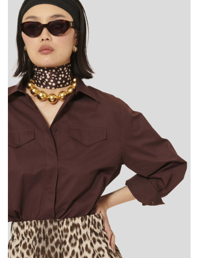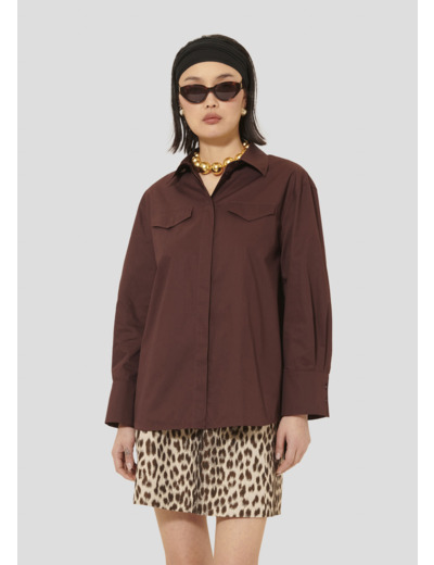 Cette chemise couleur figue en popeline possède une coupe droite, un col chemise et des manches longues boutonnées aux poignets. Deux petites poches trompe l'oeil sont présentes à la poitrine. Elle est boutonnée au-devant par de petits boutons ton sur ton dissimulés.