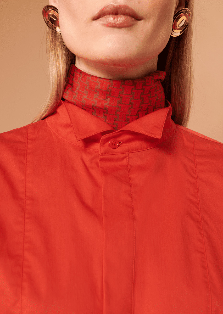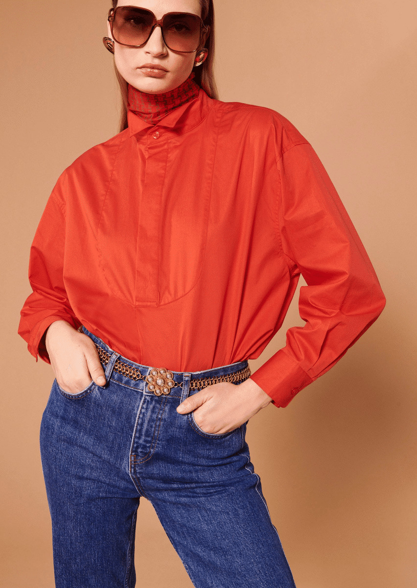 Cette chemise en popeline de coton couleur vermillon possède une coupe droite, des manches longues boutonnées aux poignets et un col cassé. Avec sa demi patte de boutonnage cachée et son pli creux au dos, c'est la pièce idéale pour un look coloré.