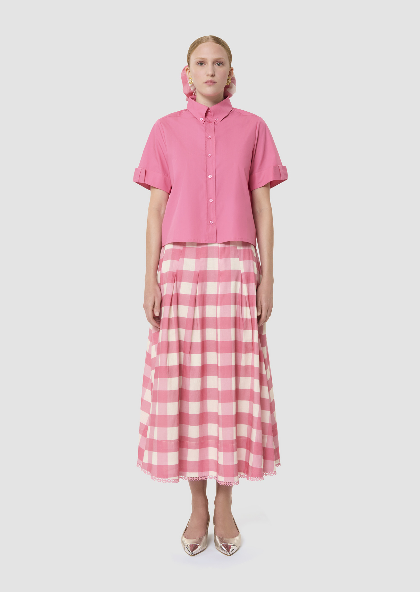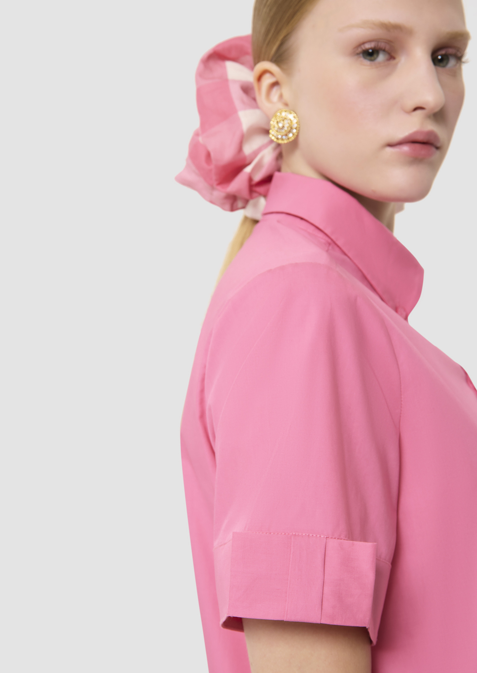 Cette chemise courte rose en popeline possède un col chemise, des manches courtes et une coupe courte droite. Elle se ferme au devant par des boutons ton sur ton. Sa touche so Tara, le petit nœud plat au revers de manche qui lui confère un look romantique.