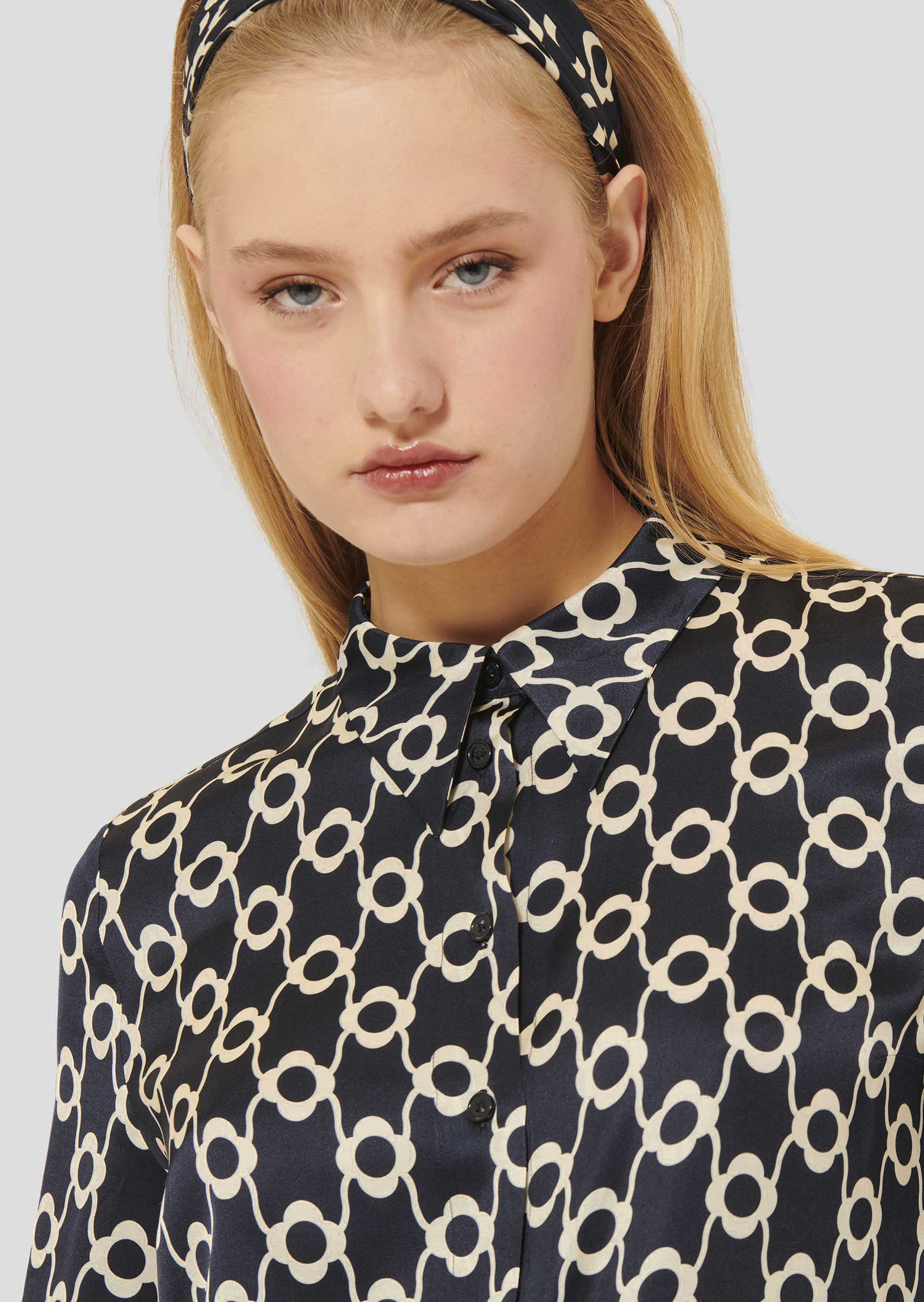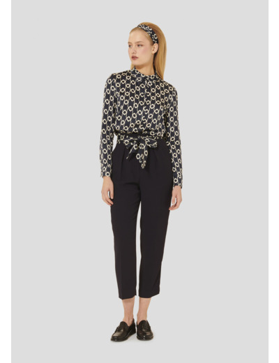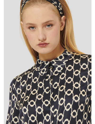 Cette chemise fluide couleur bleu nuit est imprimée de notre motif à fleurs écrues. Elle possède un col chemise, des manches longues aux poignets boutonnés et se ferme au-devant par des petits boutons bleu nuit.