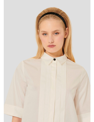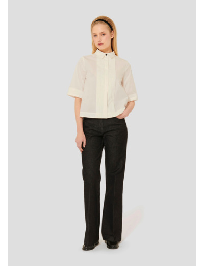 Cette chemise en popeline blanche possède des manches courtes et un col chemise classique boutonné par un bouton noir. Sa coupe est légèrement évasée et se ferme à l'avant par de petits écrus dissimulés. Son originalité réside dans ses plis à l'avant.