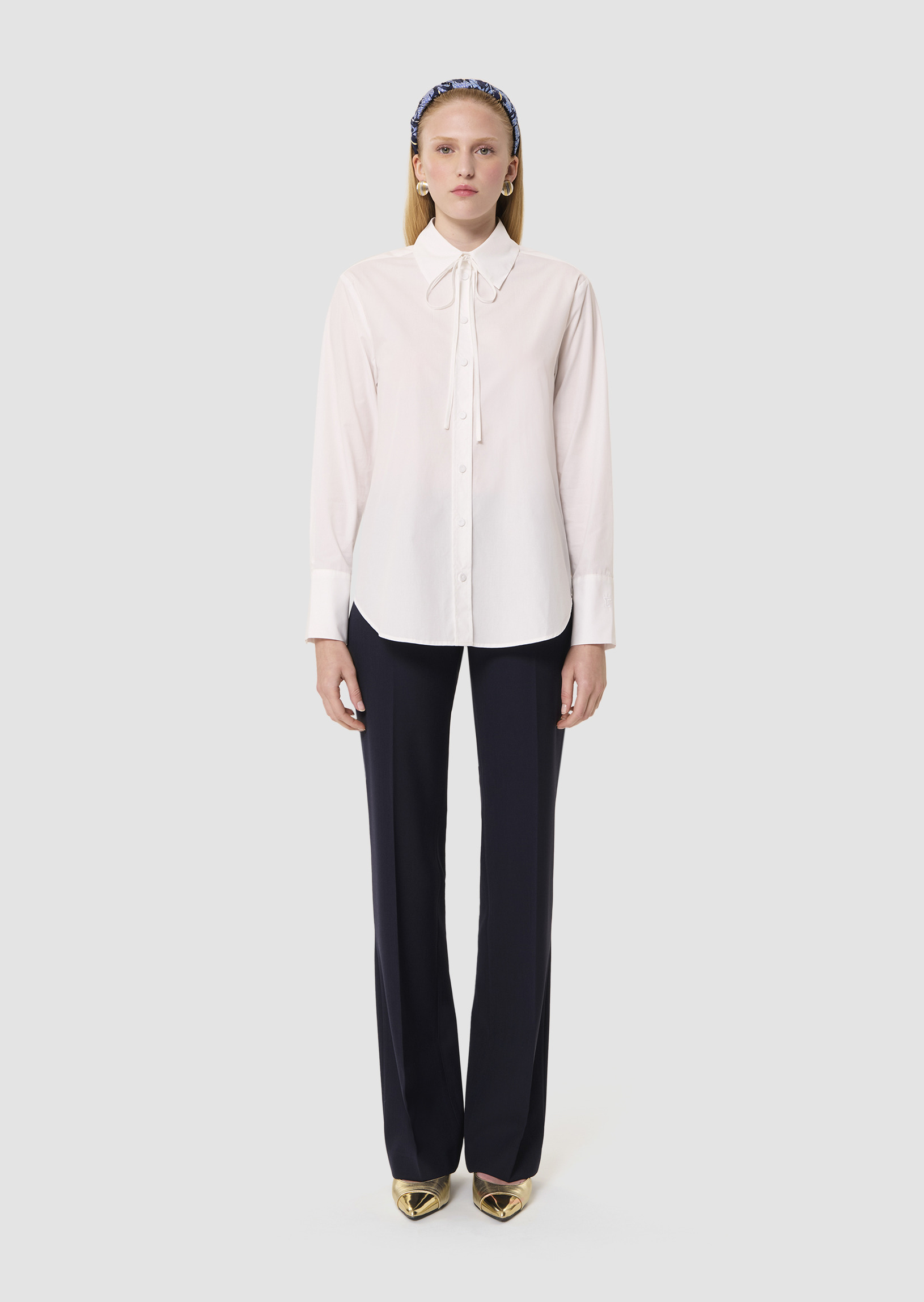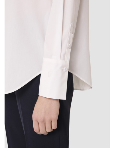 Cette chemise blanche en popeline possède une coupe droite, un col chemise et des manches longues boutonnées aux poignets. Elle se boutonne au devant par de petits boutons ton sur ton. Le logo de la maison est discrètement brodé au poignet gauche. Sa touche so Tara : le fin lien ton sur ton à nouer au col.