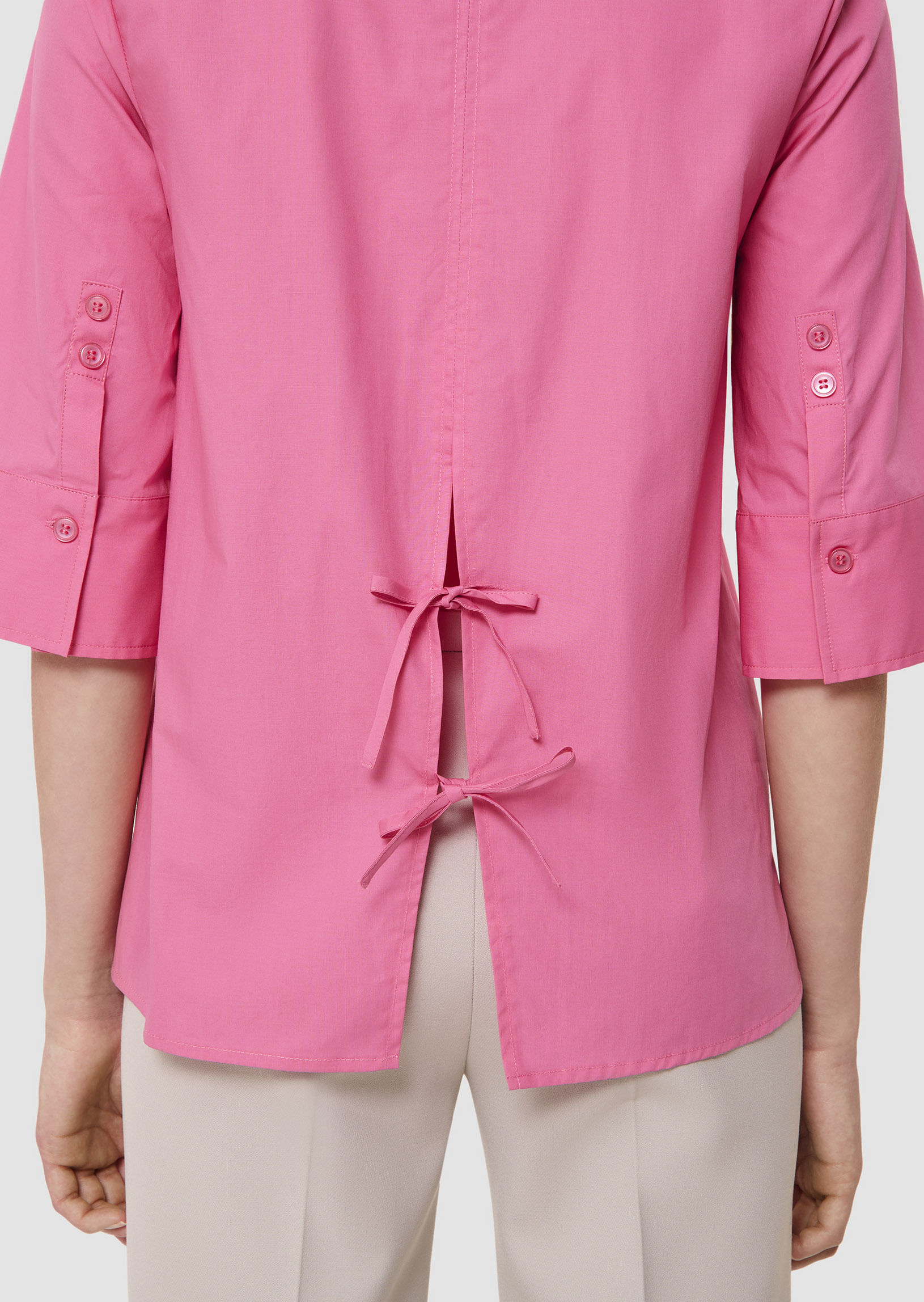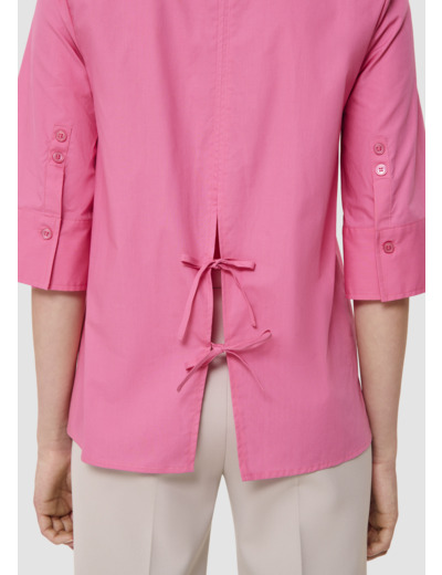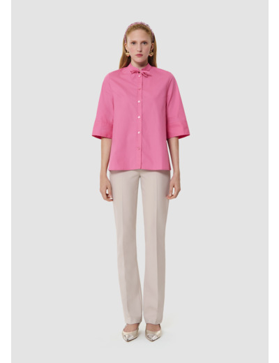 Cette chemise rose en popeline possède un col mao qui se noue au devant par de fins liens ton sur ton et des manches 3/4 évasées. Il se boutonne entièrement au devant par de petits boutons ton sur ton. Au dos, une fente est présente au bas où l'on retrouve les petits liens à nouer.