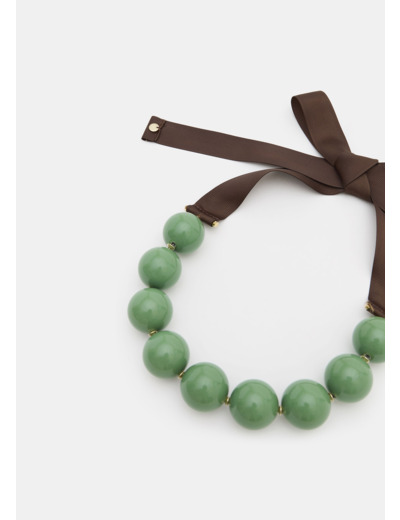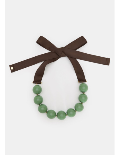 Ce collier à grosses perles couleur vert cactus se noue à la nuque grâce à un ruban en gros grain couleur chocolat. Vous pourrez ainsi ajuster sa longueur à votre convenance. Liens de 54cm chacun.