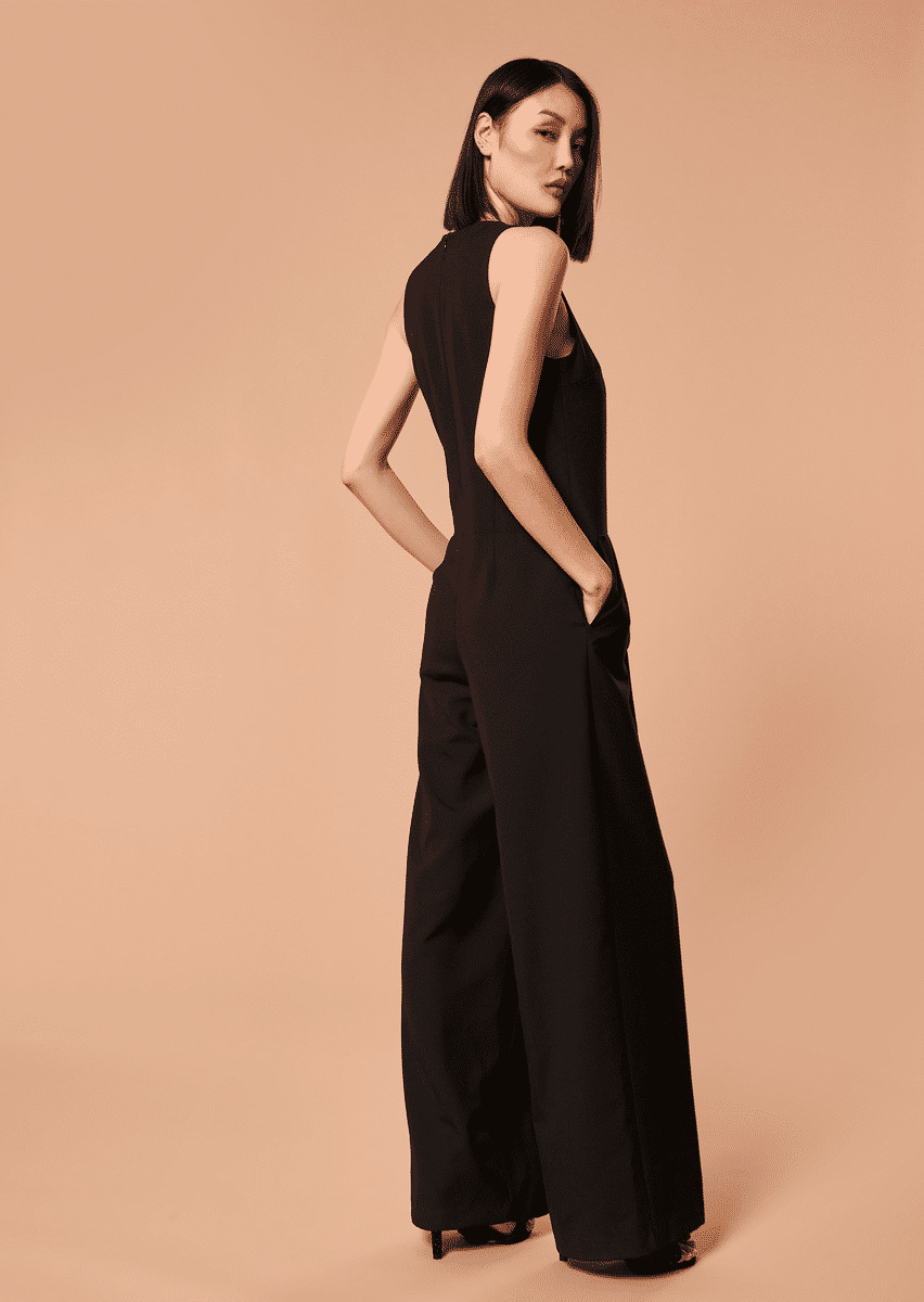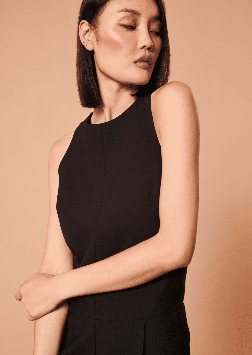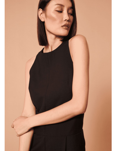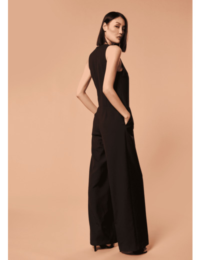 Cette combinaison noire sans manche en laine froide possède une coupe droite, un col rond et une jambe droite à pli plat. Elle a deux poches italiennes au devant pour un look masculin-féminin. Fermeture au dos par zip invisible.