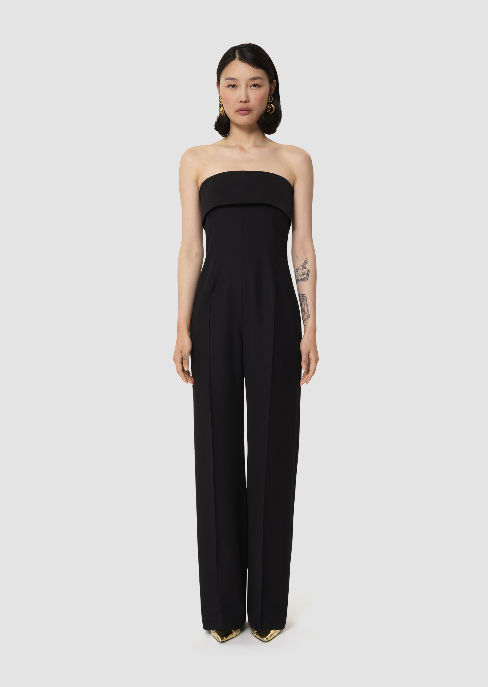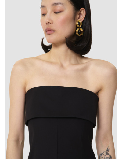 Cette combinaison bustier noire en laine tailleur possède un large revers ultra élégant. Elle est cintrée à la taille et sa jambe large a un pli plat. Elle se ferme au dos par un zip invisible.