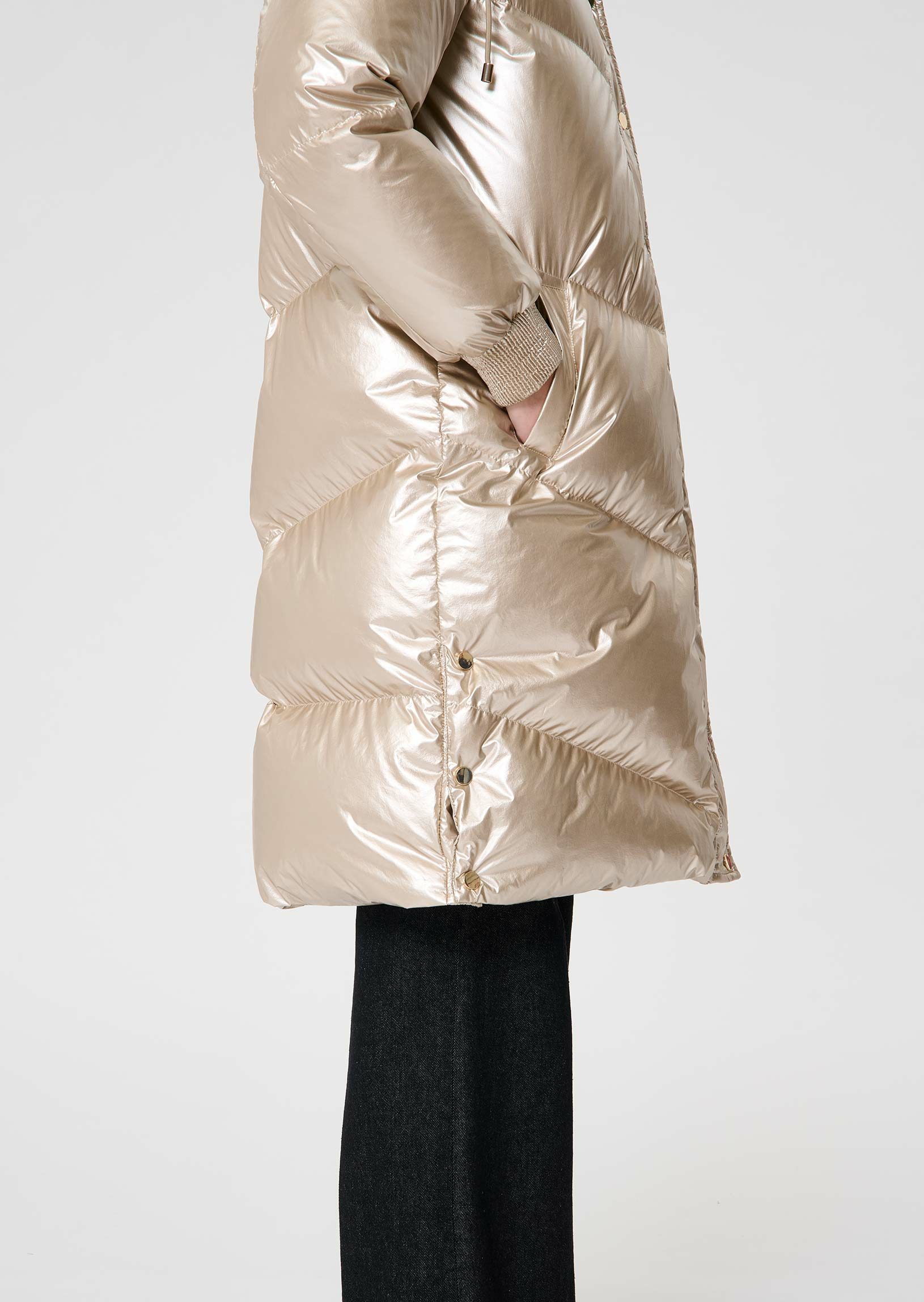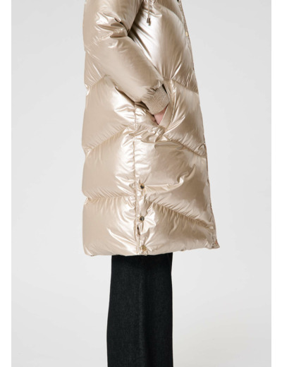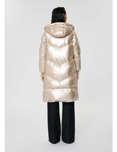 Cette longue doudoune couleur champagne possède des manches longues élastiquées aux poignets. Elle se ferme au-devant par un long zip dissimulé et des boutons pression ton sur ton. Elle possède une capuche pouvant se resserrer par des liens ton sur ton, ainsi que deux grandes poches aux côtés. C'est la pièce idéale pour rester élégamment au chaud cette saison.
