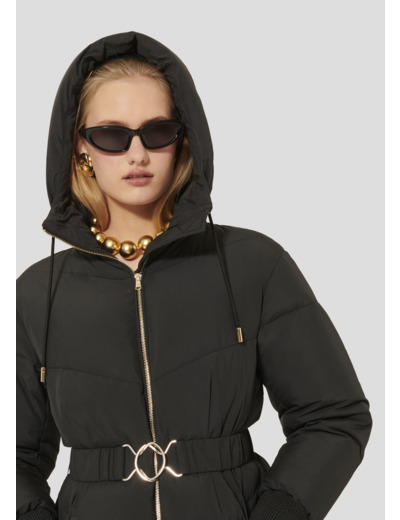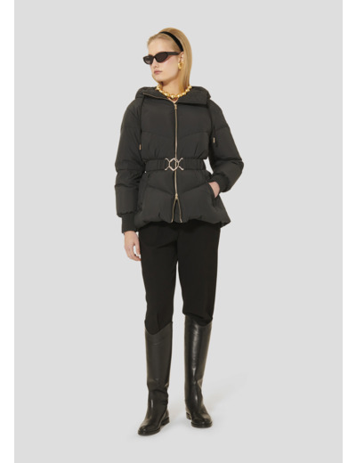 Cette doudoune noire matte possède des manches longues élastiquées aux poignets. Sa taille est marquée par une ceinture élastiquée ton sur ton se fermant par une boucle en métal doré. Elle se ferme au-devant par un long zip doré à double curseur. Elle possède une capuche pouvant se resserrer par des liens ton sur ton, ainsi que deux poches aux côtés. C'est la pièce idéale pour rester élégamment au chaud cette saison.
