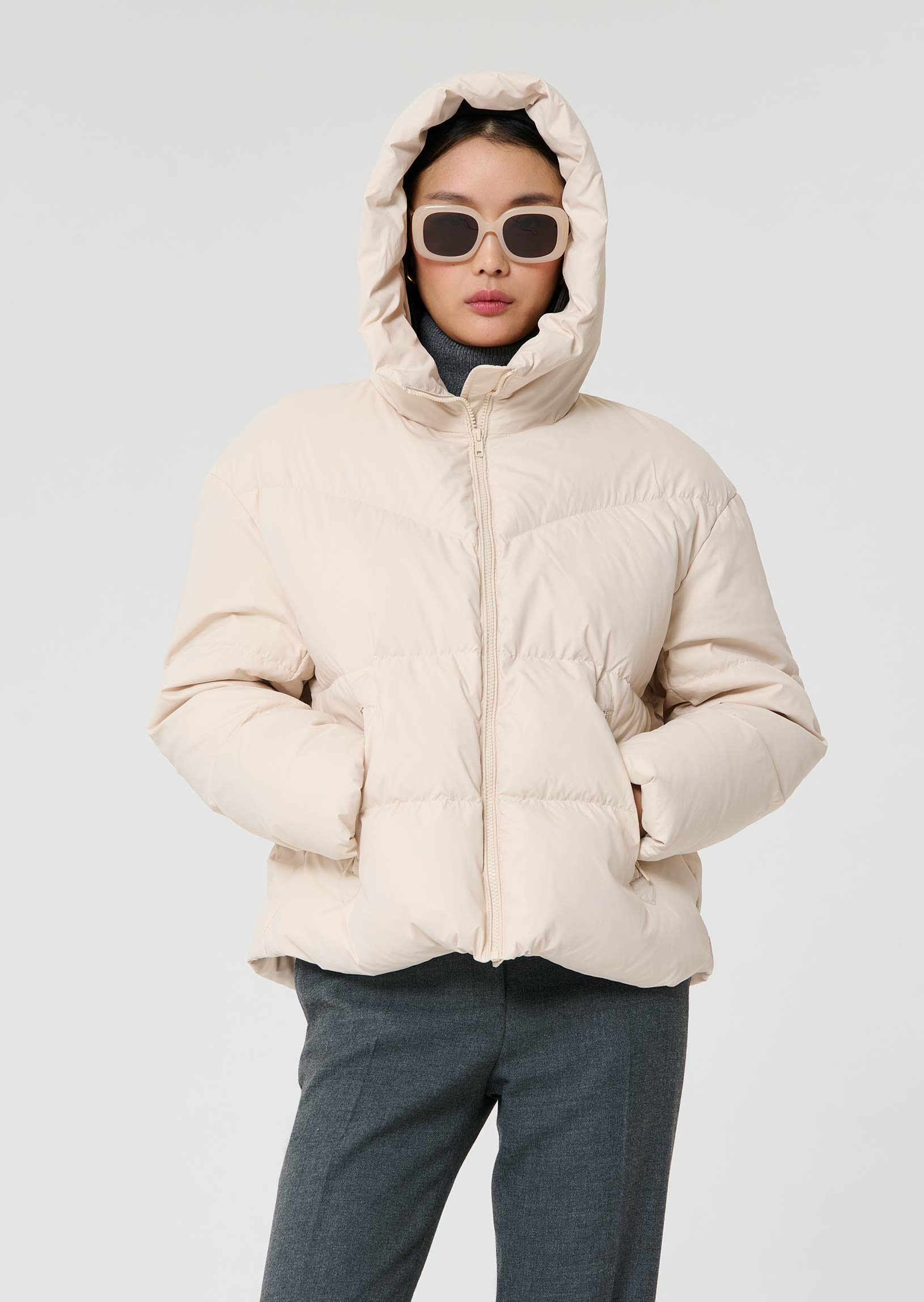 Cette doudoune matte couleur craie possède des manches longues, deux grandes poches à zip aux côtés et un col montant. Elle se ferme au devant par un zip.