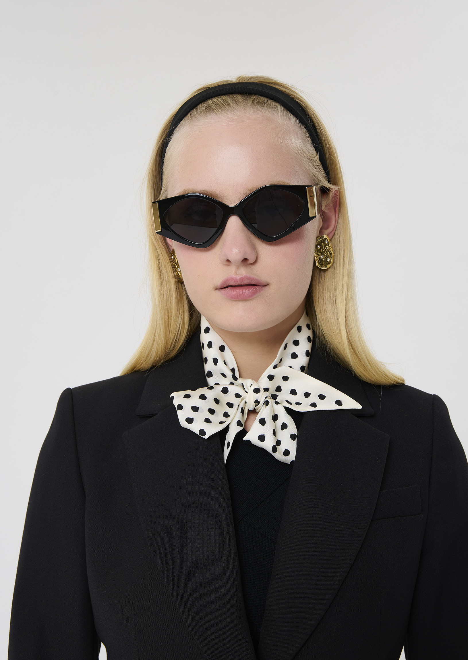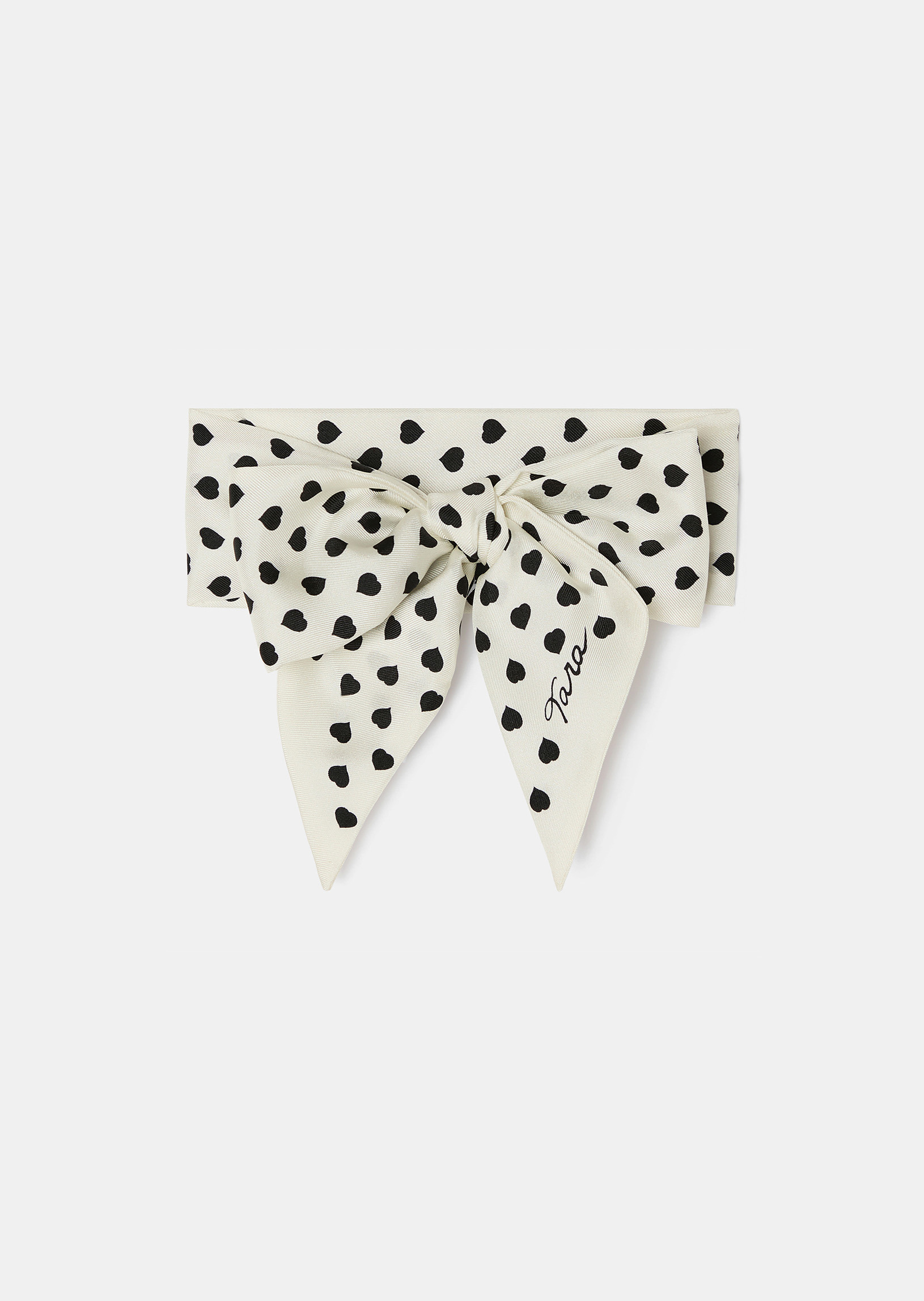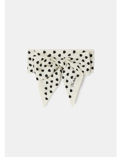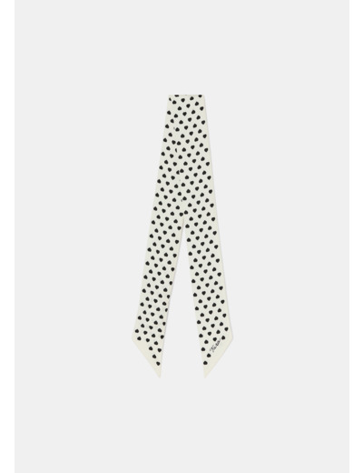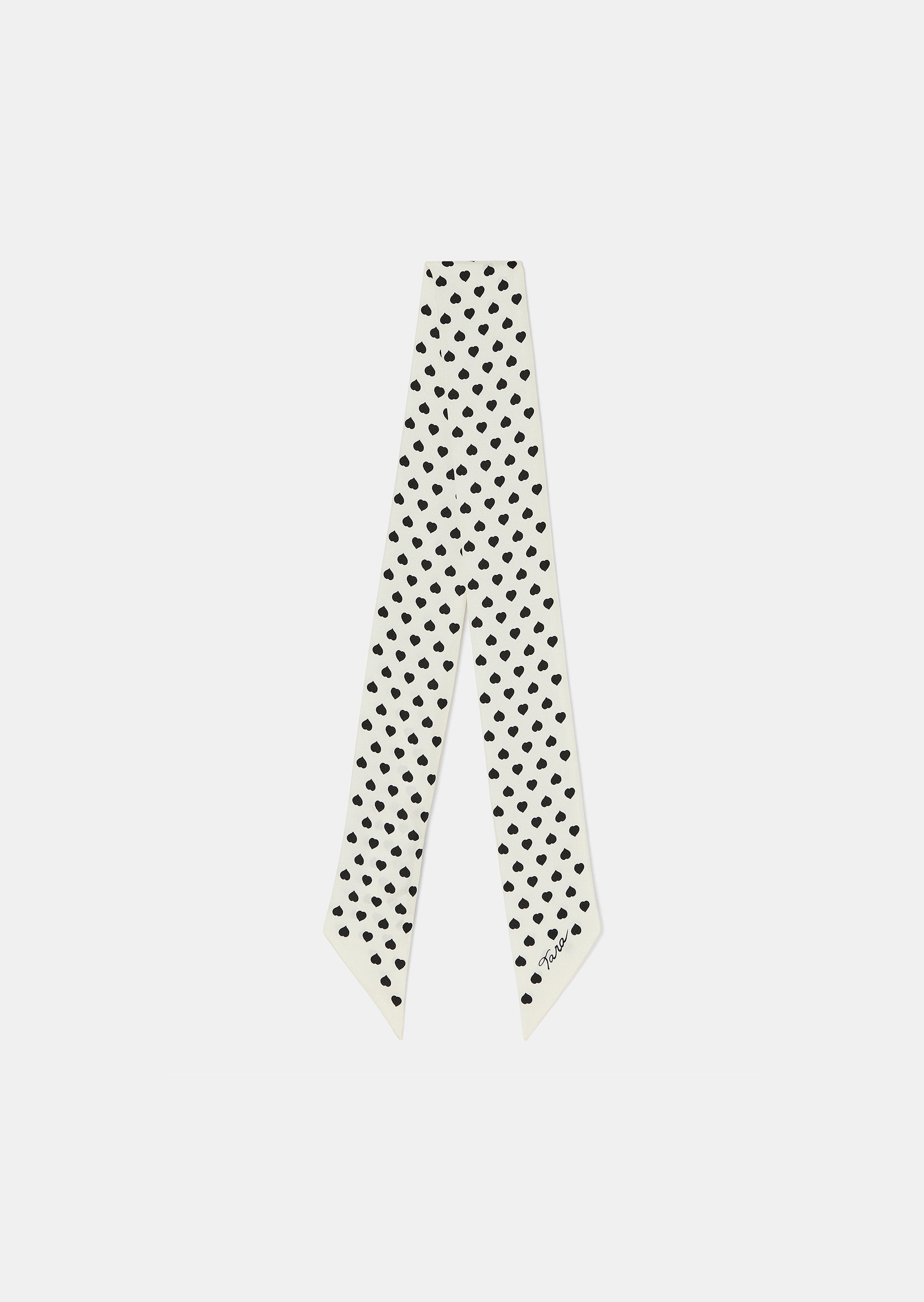 Ce joli foulard de soie couleur craie est entièrement imprimé de notre motif à petits coeurs noirs. A nouer en lavallière ou en cravate, sa couleur lumineuse apportera une touche supplémentaire de féminité à tous vos looks.