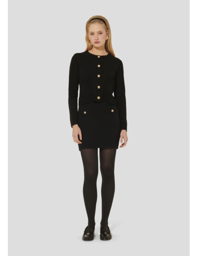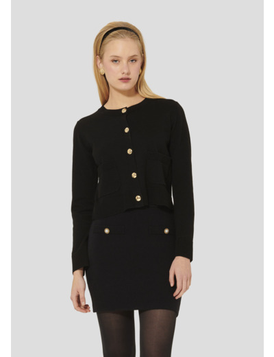 Ce gilet noir possède des manches longues, un col rond et de petites poches plaquées aux côtés. Sa coupe courte se boutonne entièrement par de jolis boutons dorés ornés du monogramme de la maison. Confectionné avec de la laine, il vous apportera confort et douceur. On le porte en matching set avec le pull Pastelle assorti.
