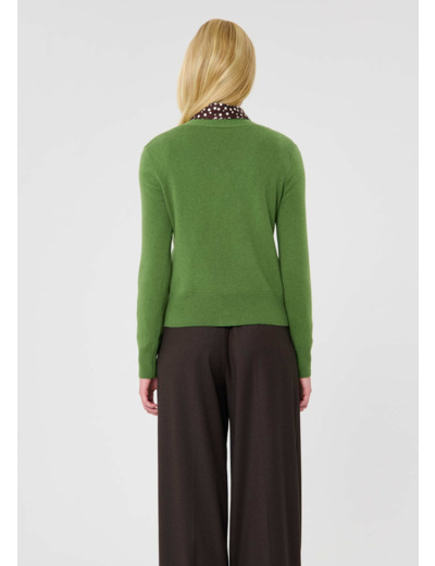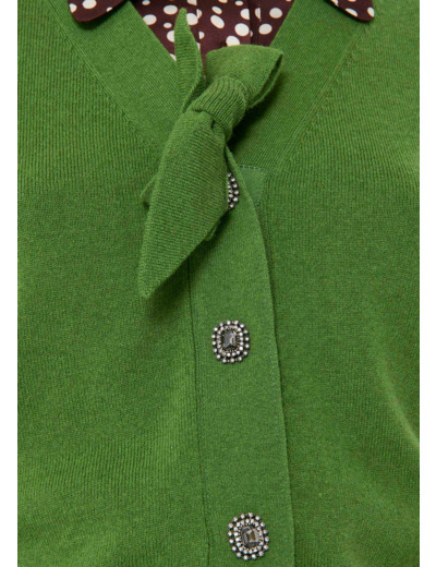 Ce pull en laine couleur cactus possède un col V à nouer et des manches longues. De larges bords-côtes marquent le bas et les poignets.
