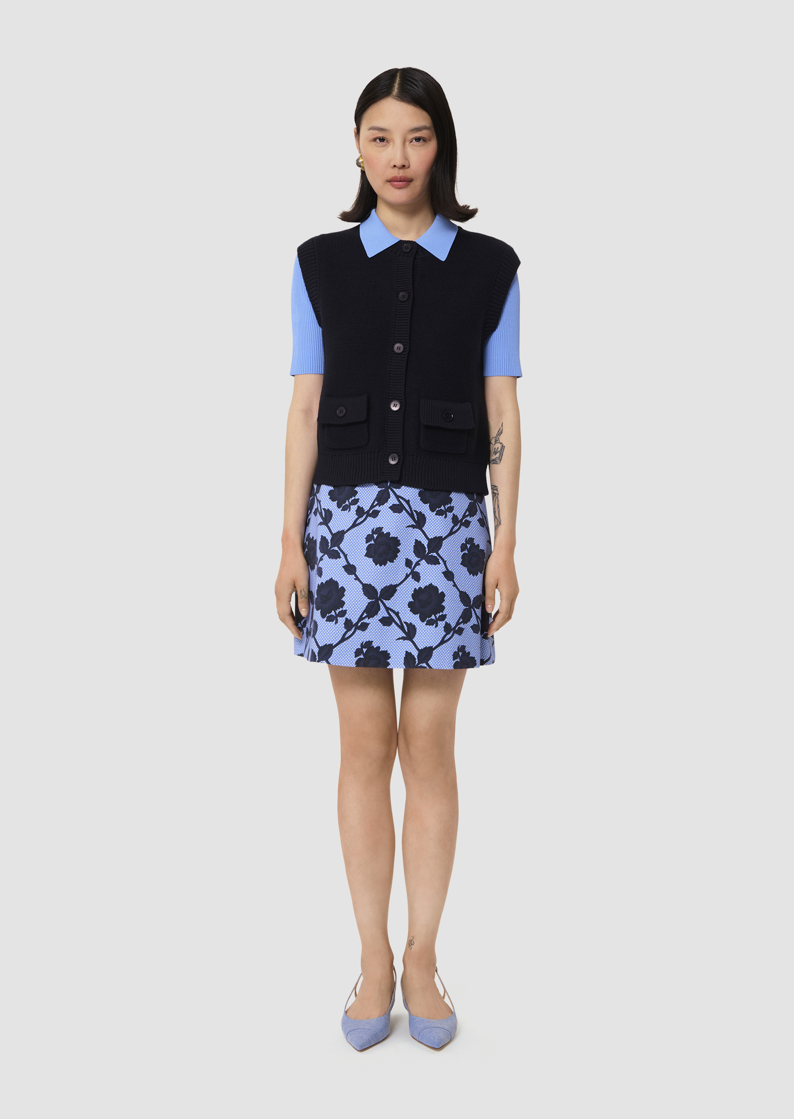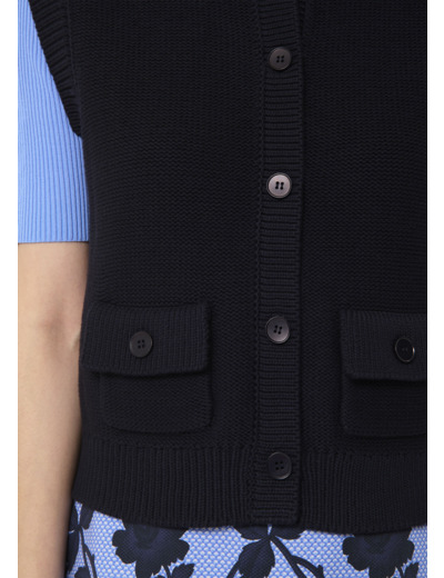 Confectionné en 100 % coton, ce gilet allie douceur et légèreté pour vous accompagner tout au long de la journée. Sa teinte bleu nuit profonde apporte une touche raffinée, facile à assortir à vos basiques ou pièces plus audacieuses. Sa coupe soignée souligne la silhouette sans contrainte, idéale pour un look casual chic ou professionnel.