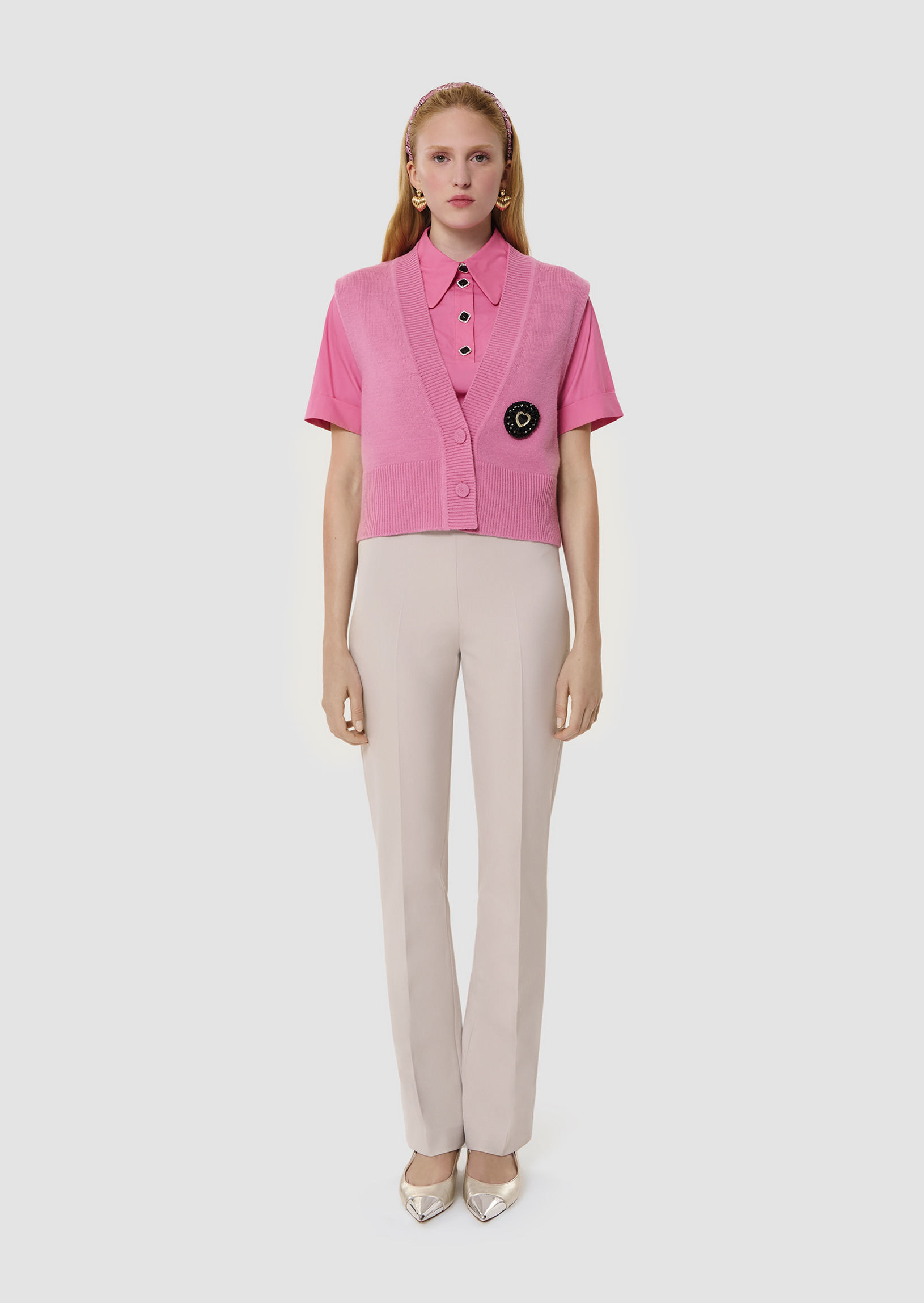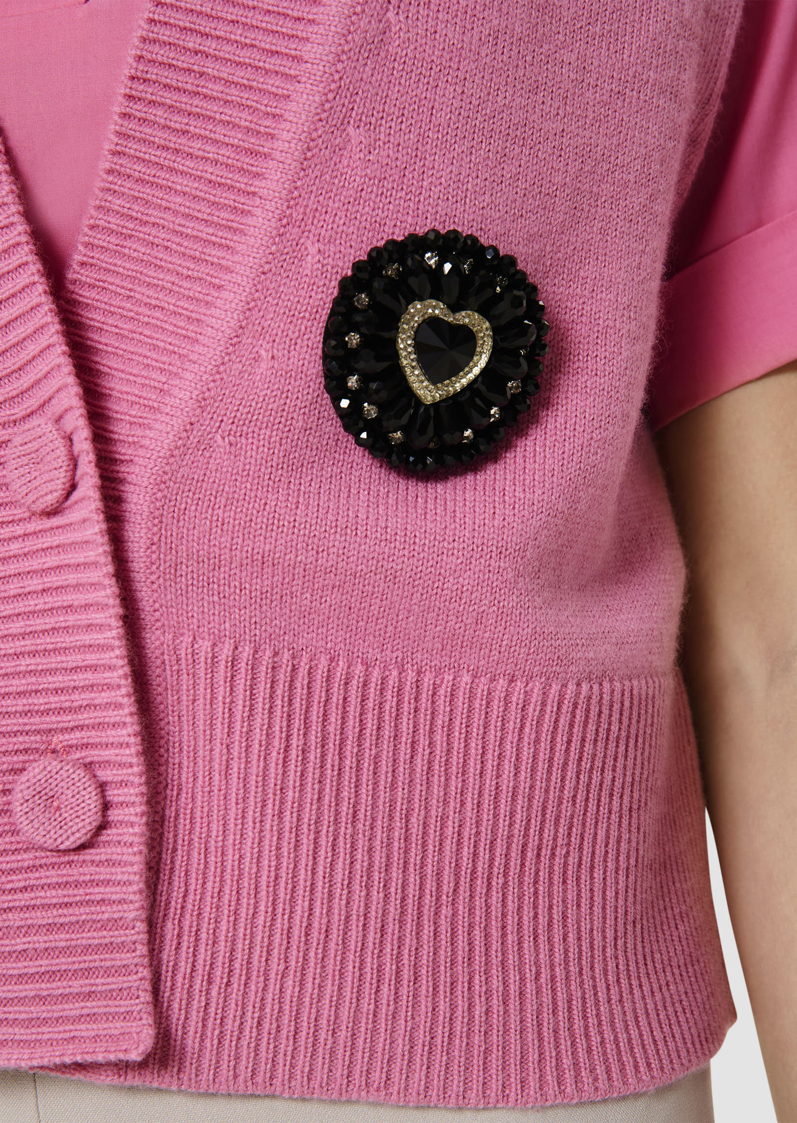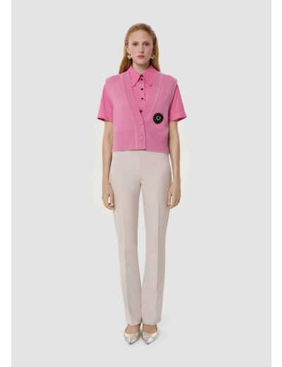 Ce gilet sans manches couleur rose bonbon possède une coupe droite légèrement oversized, une large encolure en V et se boutonne par deux boutons recouverts ton sur ton. Sa touche so Tara réside dans sa grande broche à strass noirs et argents brodée au devant. Il est entièrement confectionné en laine mérinos et alpaga pour vous apporter confort et douceur.