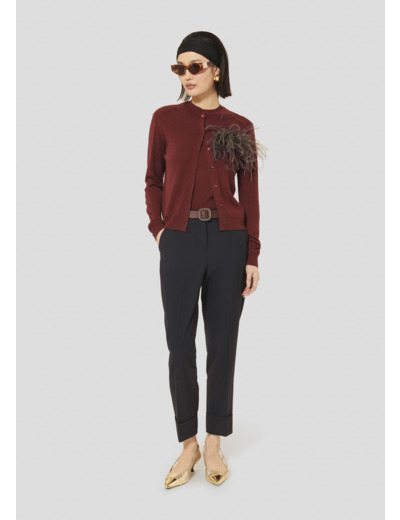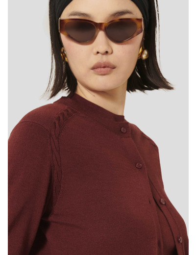 Ce gilet fin couleur bordeaux possède un col rond et des manches longues. De délicats détails de maille tressée ton sur ton décorent les épaules. Il se ferme au-devant par de petits boutons bordeaux. Il est entièrement confectionné en laine merinos extrafine pour vous tenir bien au chaud tout au long de la saison.