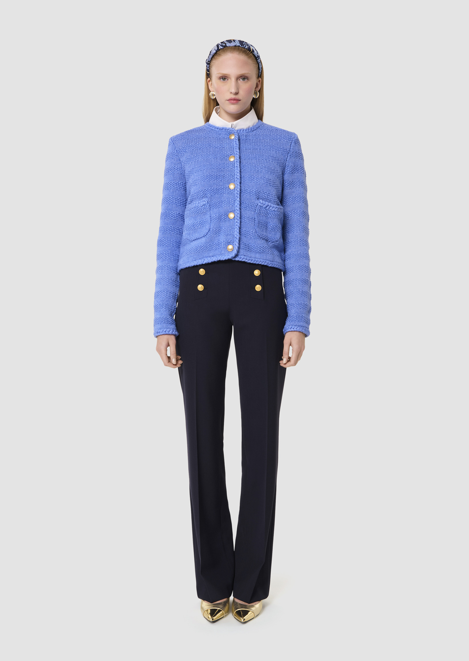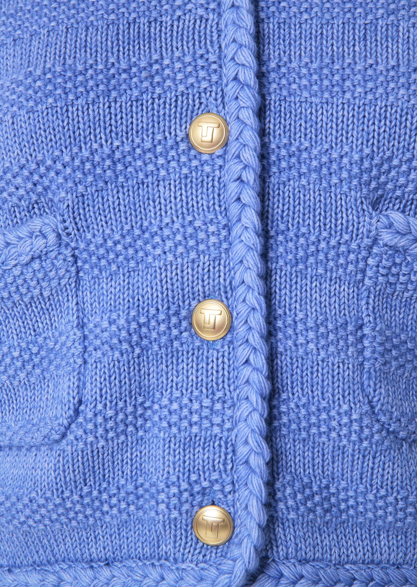 Ce gilet couleur bleu horizon en coton épais possède des manches longues, une encolure ronde et de petites poches plaquées au devant. Sa coupe courte et droite se pare d'un jeu de maille fantaisie pour former des rayures en trompe l'œil. Il est souligné au devant et aux poches par un jeu de maille tressée. Il se ferme au devant par des boutons dorés décorés du monogramme de la maison.