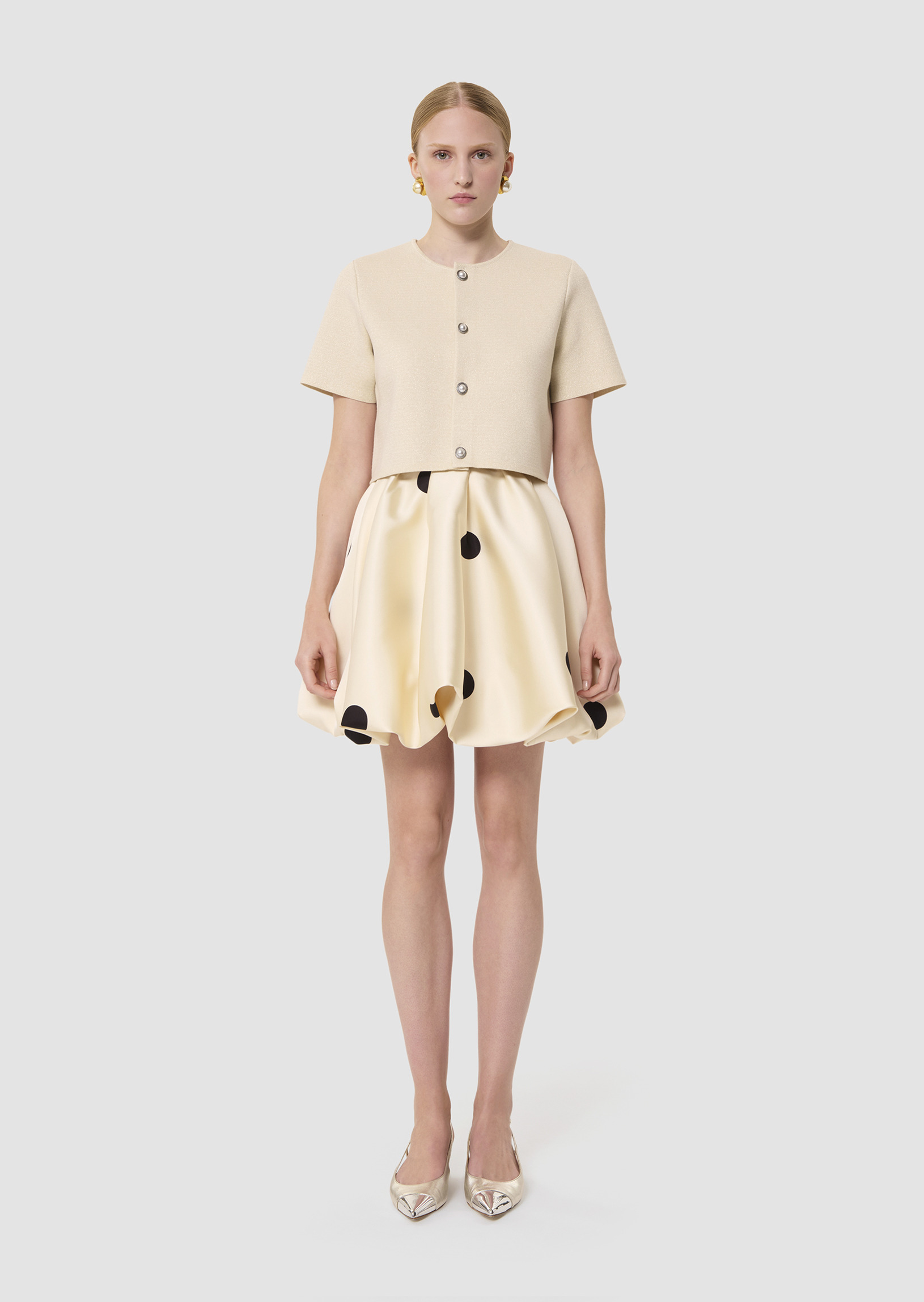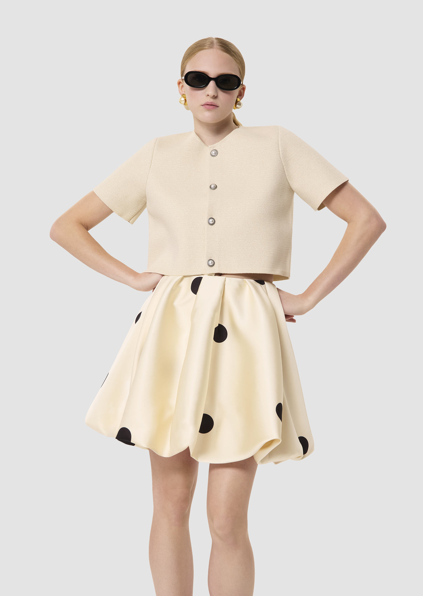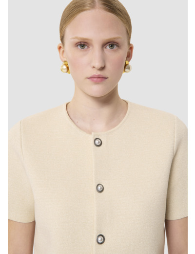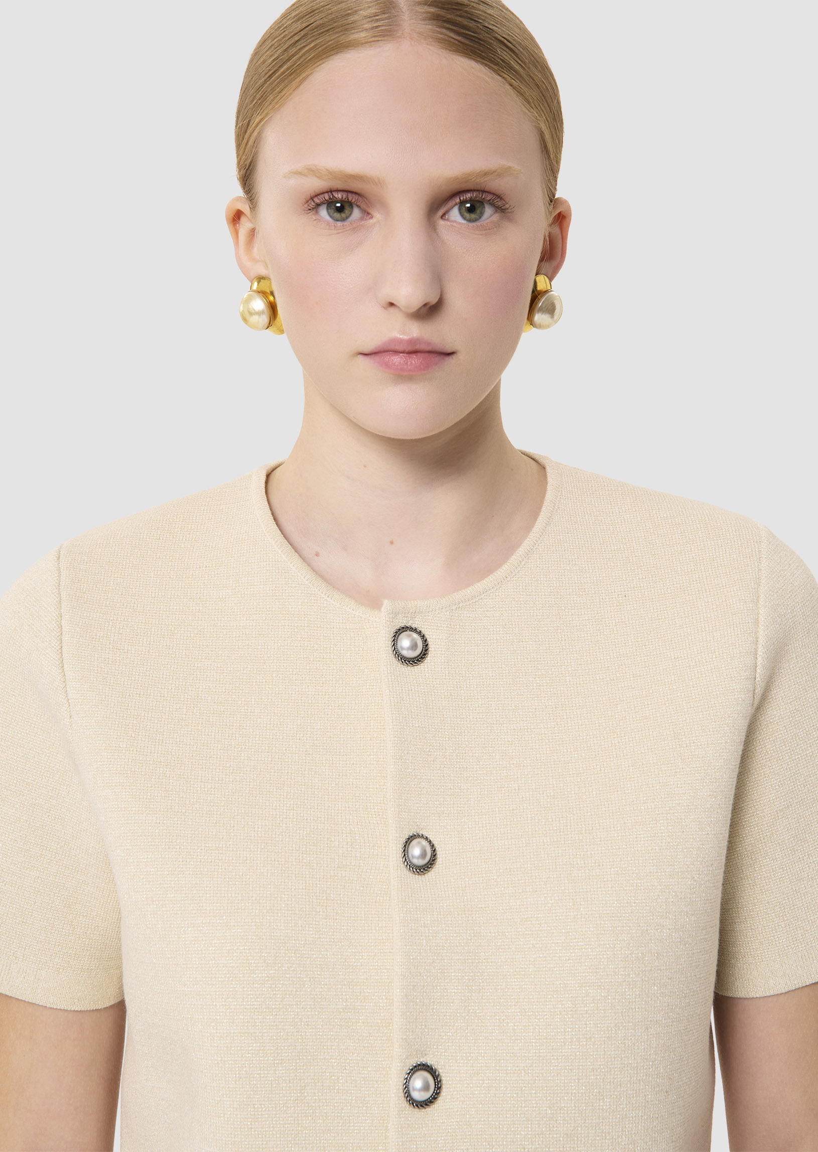 Ce gilet court couleur or possède des manches courtes et un col rond. Il est confectionné en maille fine compacte agrémentée de fins fils de lurex et se ferme par des boutons bijoux nacrés. De petites épaulettes structurent la carrure.