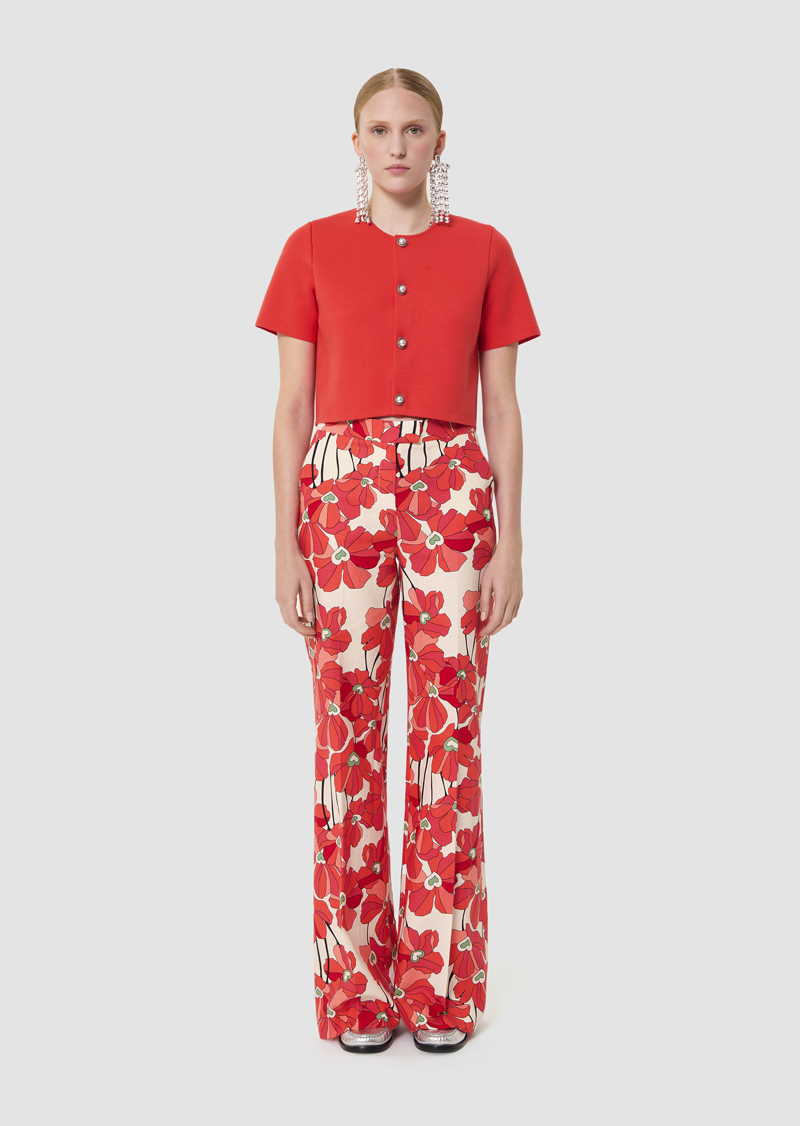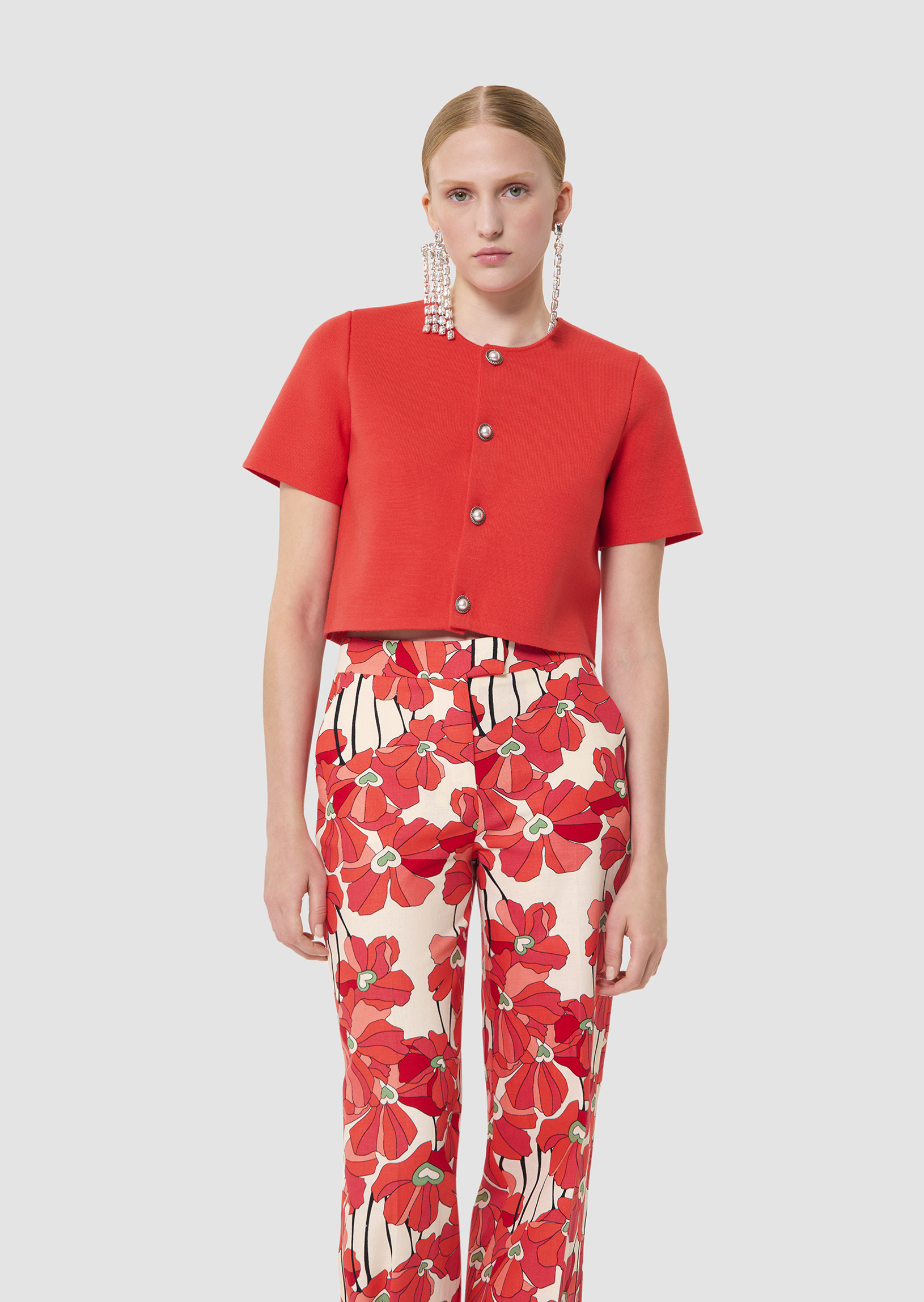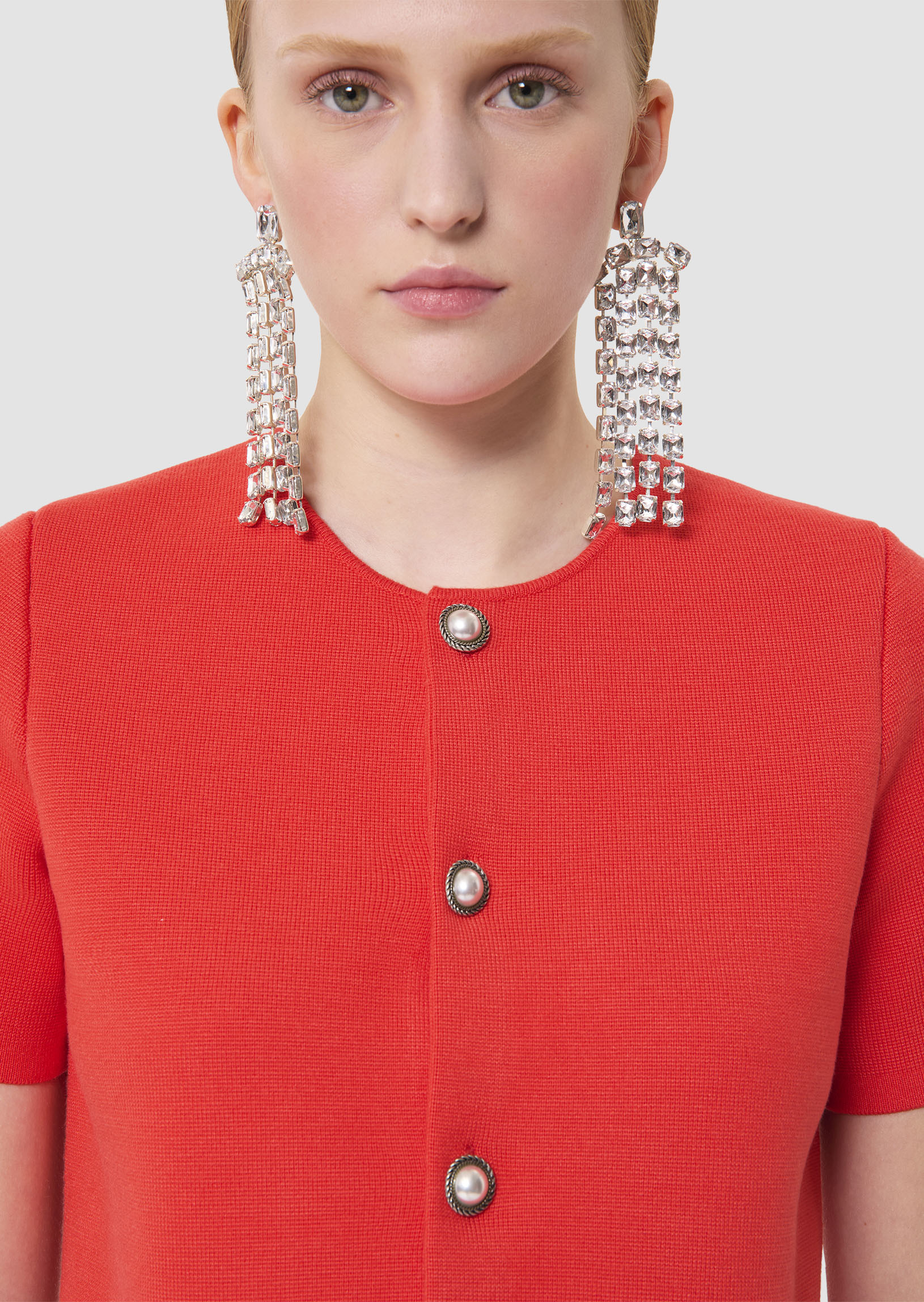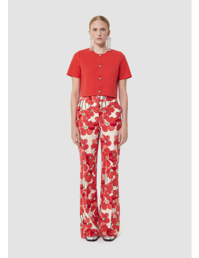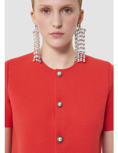 Ce gilet court couleur rouge coquelicot possède des manches courtes et un col rond. Il est confectionné en maille fine compacte et se ferme par des boutons bijoux nacrés. De petites épaulettes structurent la carrure.