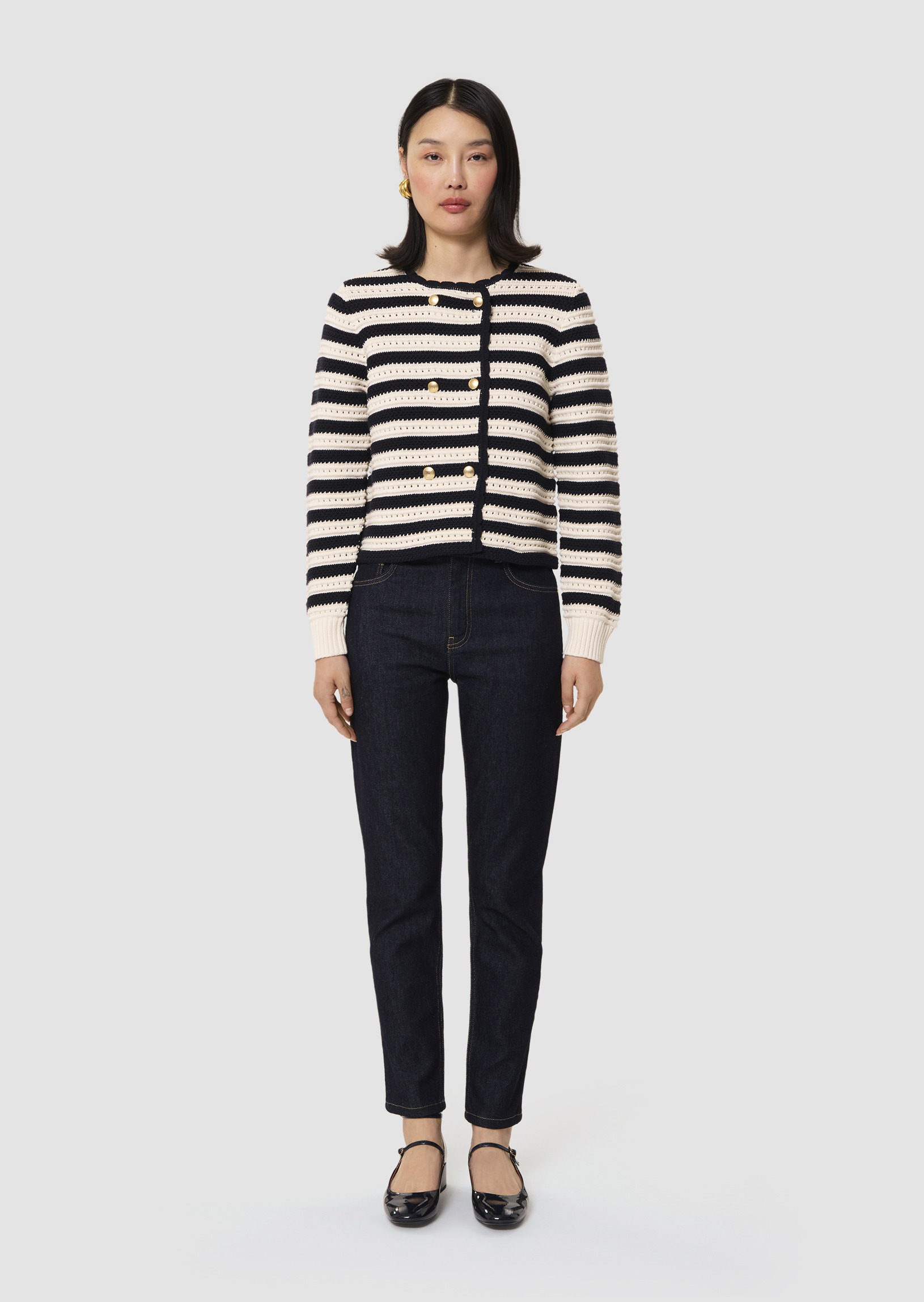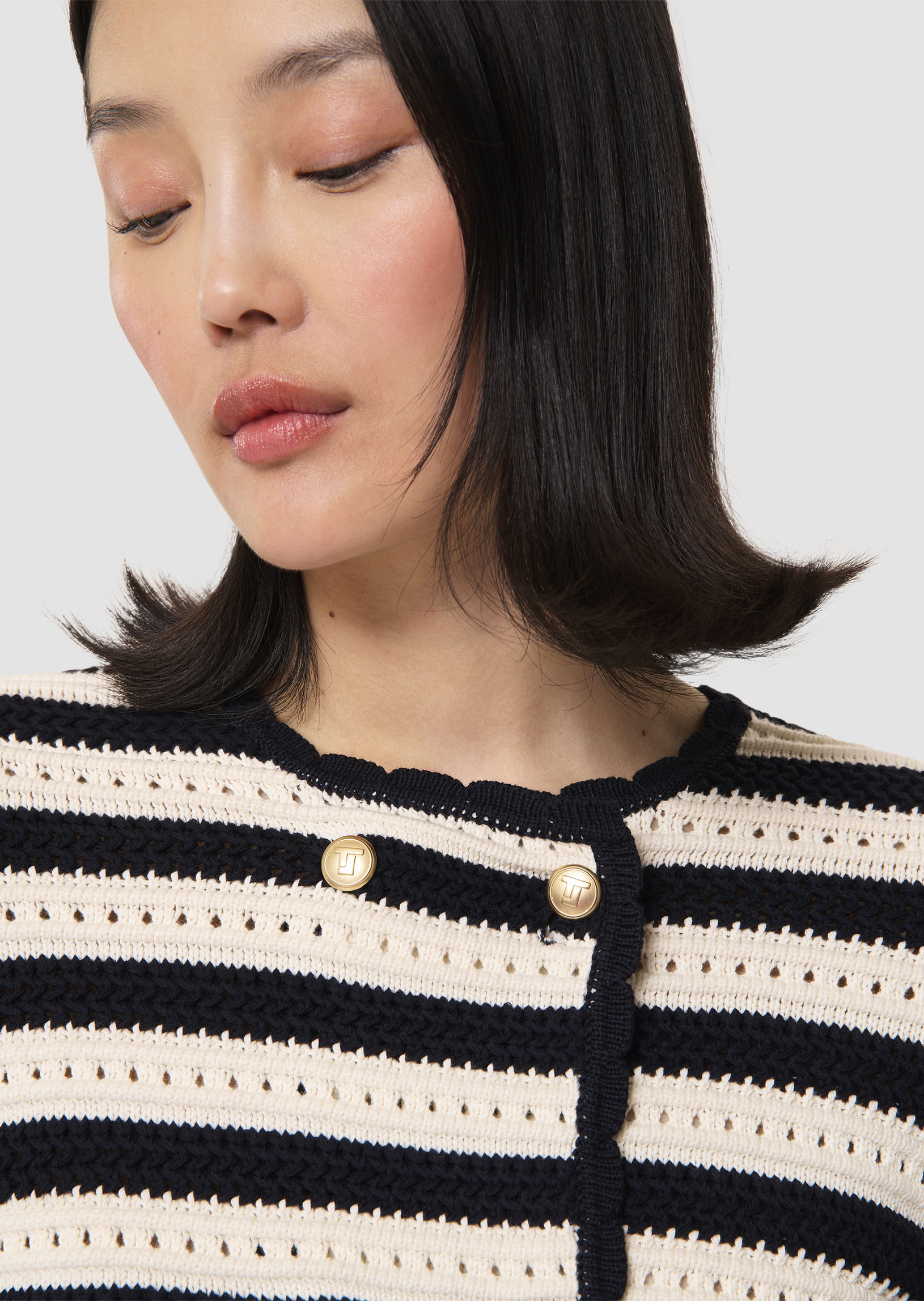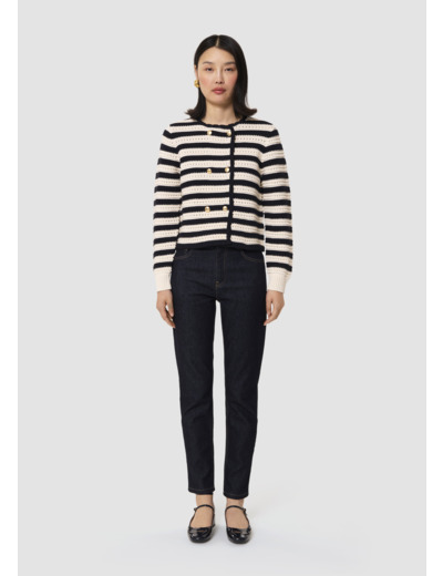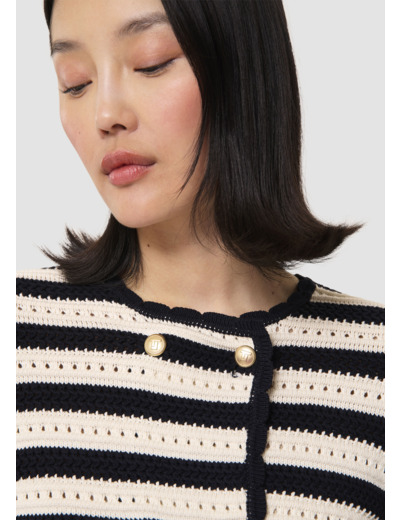 Ce gilet en maille fantaisie rayée bleu nuit et écru possède un col rond et des manches longues. Il est souligné d'un liseré festonné bleu nuit au col et au devant. Il se ferme au devant par une double boutonnage de boutons dorés décorés du monogramme de la maison.