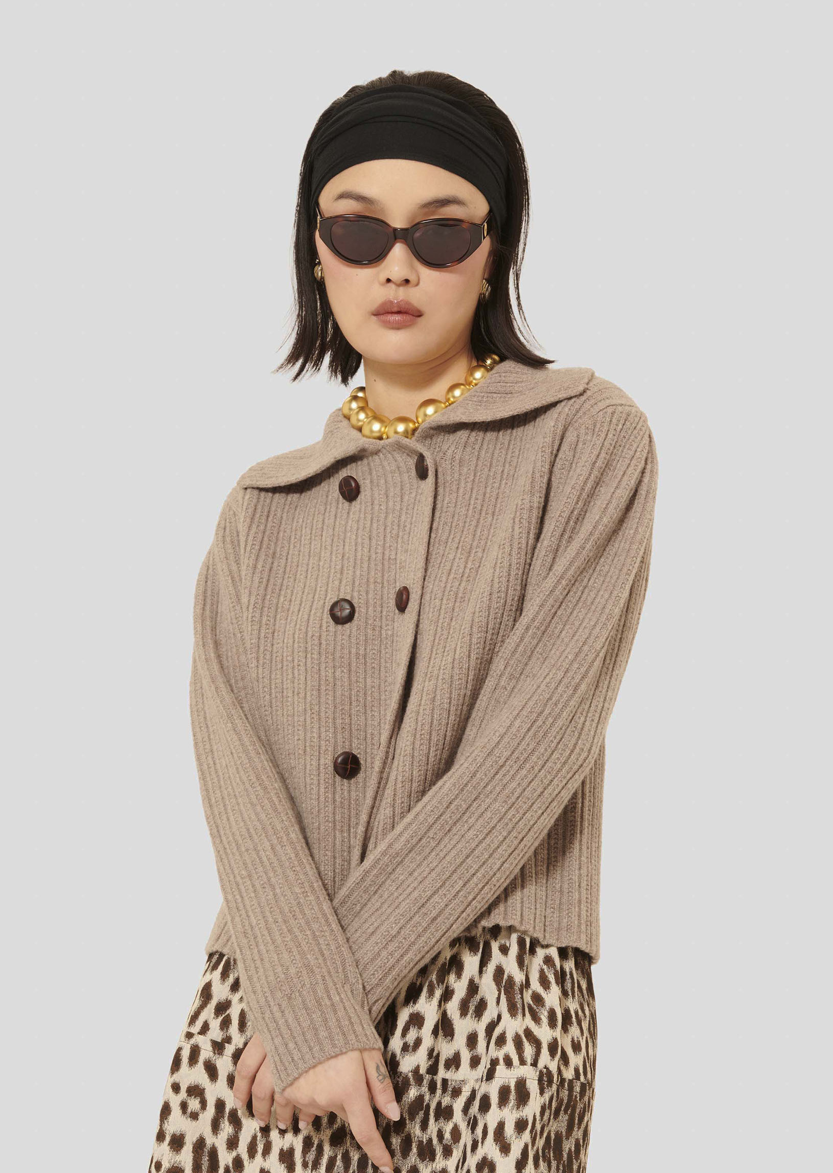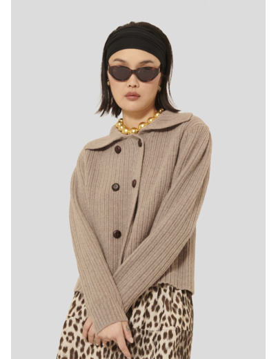 Ce pull en laine couleur noisette possède un col camionneur et des manches longues. Il se ferme au-devant par des boutons marron.