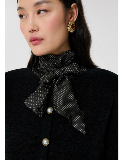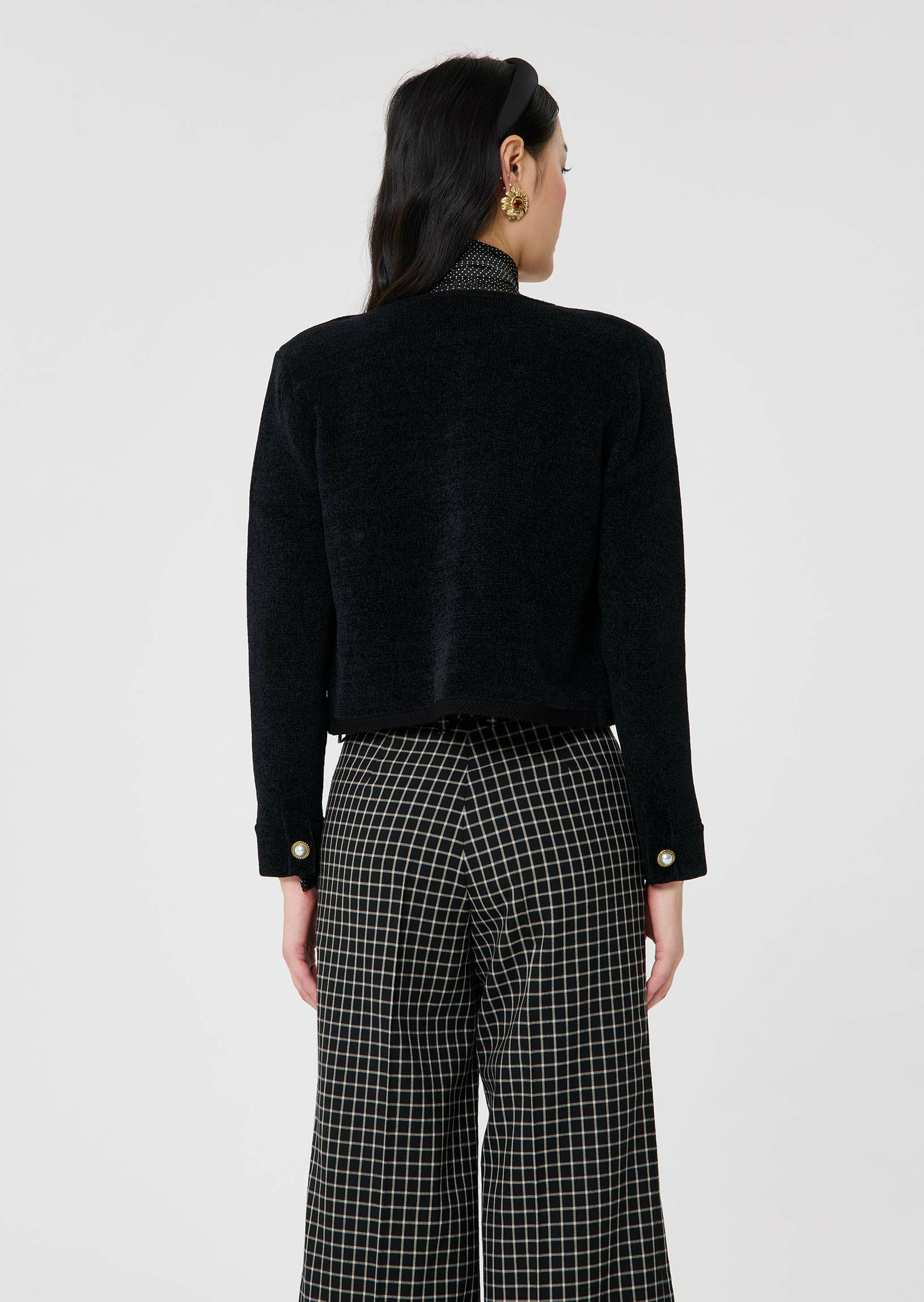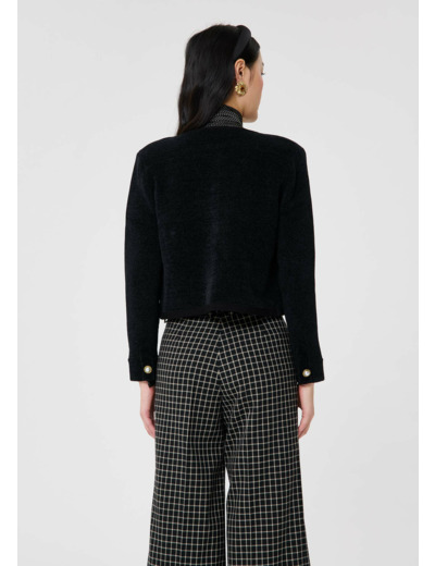 Ce cardigan noir possède un col rond, des manches longues boutonnées aux poignets et une coupe courte droite. Il se ferme par des gros boutons bijoux dorés agrémentés d'une perle nacrée. Il possède deux poches plaquées aux côtés. Confectionné en maille compacte, il est ultra doux et agréable.