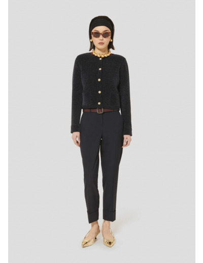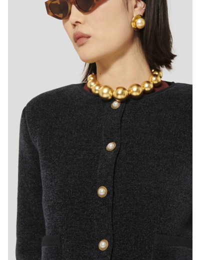 Ce cardigan bleu nuit possède un col rond, des manches longues boutonnées aux poignets et une coupe courte droite. Il se ferme par des gros boutons bijoux dorés agrémentés d'une perle nacrée. Il possède deux poches plaquées aux côtés. Confectionné en maille compacte, il est ultra doux et agréable.