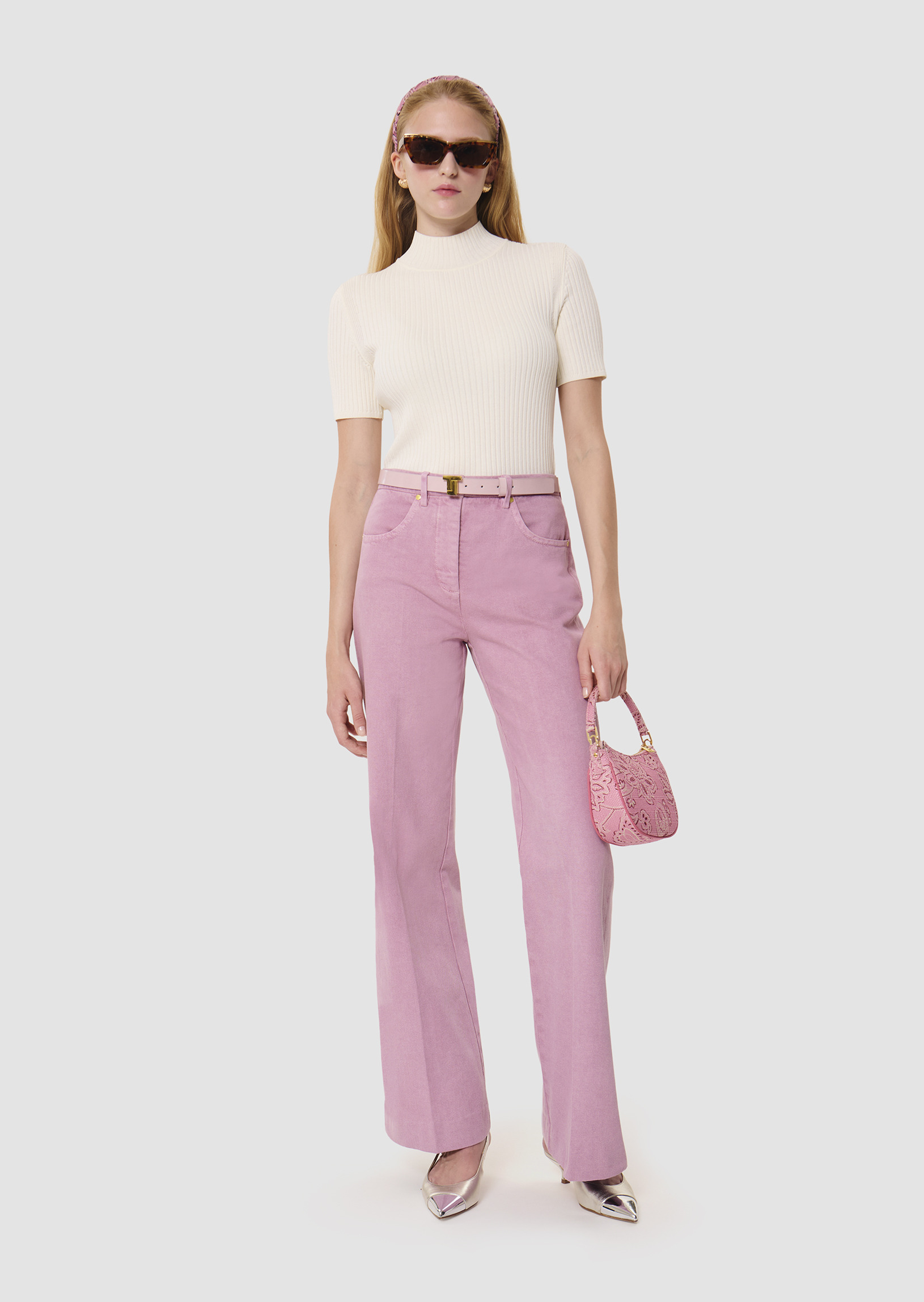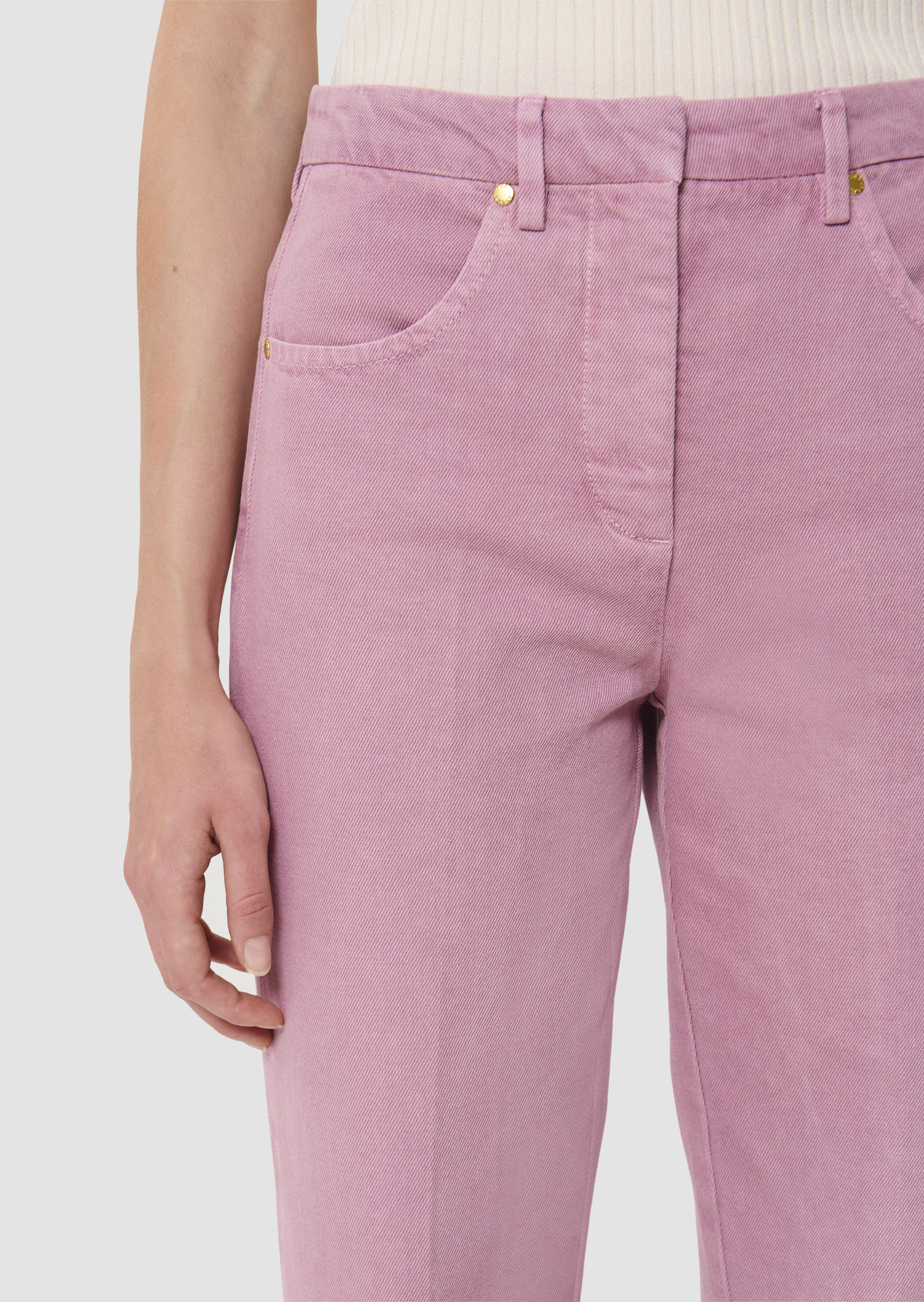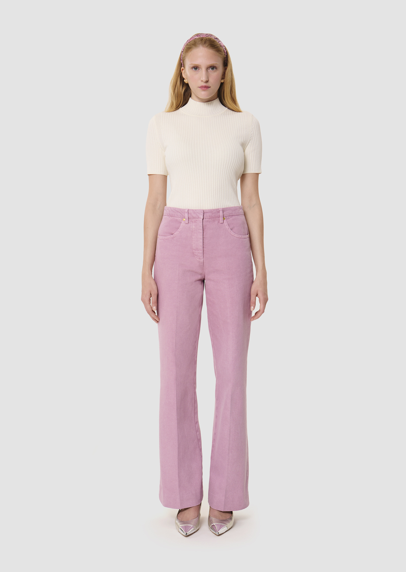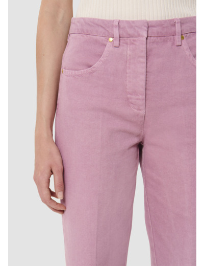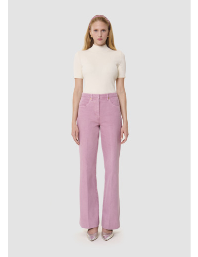 Ce jean taille haute rose en denim léger possède une coupe bootcut et une jambe marquée d'un pli plat. Ultra élégant et confortable, il est facile à assortir. Sa coupe et sa couleur ne font pas seulement de lui le jean parfait pour la saison, mais un intemporel fait pour durer. Fermeture classique par un bouton doré et un zip. Idéal à assortir avec le top Tokono blanc pour un total look.