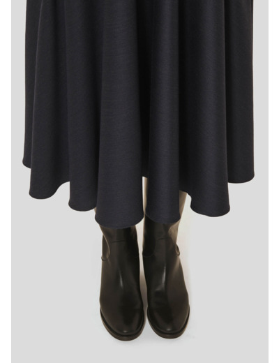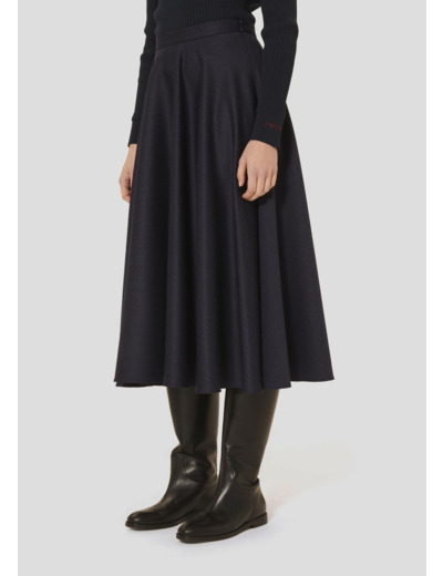 Cette jupe longue en flanelle couleur bleu nuit possède une coupe fluide et évasée, lui donnant un esprit romantique. Fermeture par zip invisible au côté.