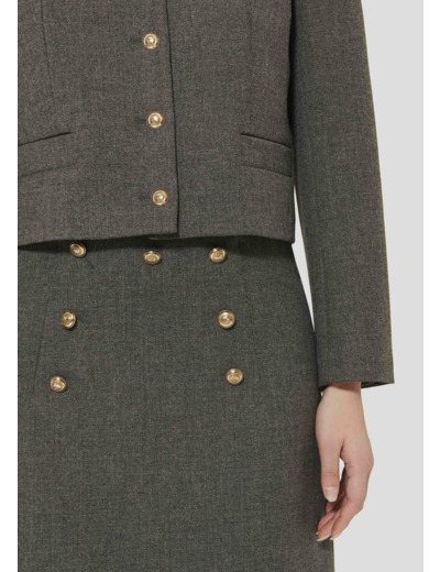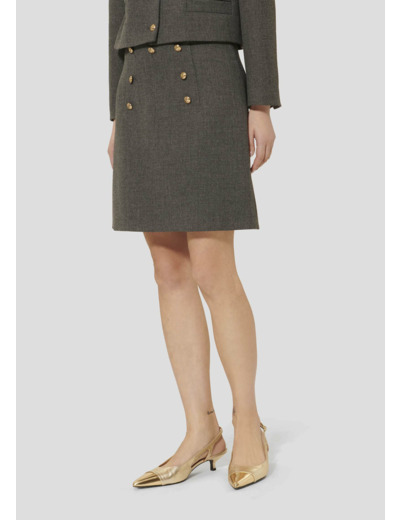 Cette jupe courte grise en toile possède une coupe courte et deux poches passepoilées au dos, et est décorée au-devant par des boutons dorés. Elle se ferme par un zip invisible au dos.