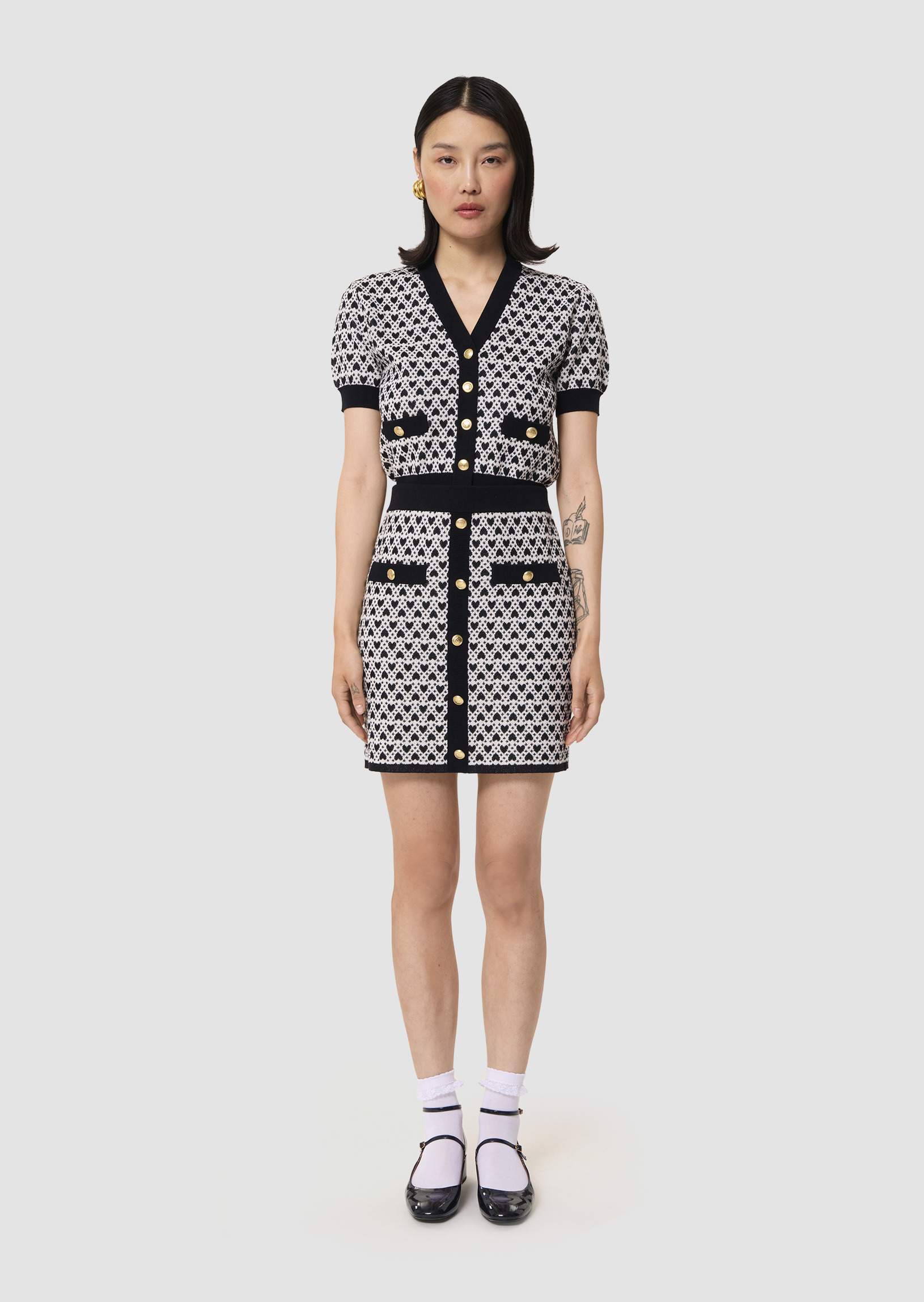 Cette jupe courte en coton écru imprimé mini coeurs bleu nuit possède une coupe près du corps stretch. Deux poches en trompe-l'oeil ornées de boutons dorés décorés du monogramme de la marque décorent le devant. Un empiècement bleu nuit crée une patte de boutonnage en trompe-l'oeil au devant. Optez pour un total look preppy avec le gilet Gavril.