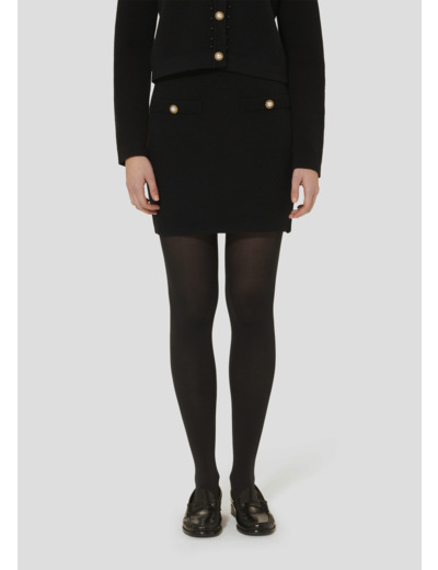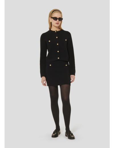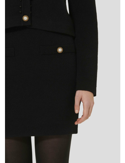 Cette jupe courte noire en maille possède une coupe crayon. Sa taille élastique vous apportera une tenue confortable. Les poches passepoilées au-devant sont décorées de jolis boutons bijoux nacrés. On la porte avec le gilet Guetty assorti pour un total look féminin et élégant.