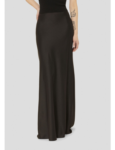 Cette jupe noire extra longue en satin possède une coupe fluide lui donnant un esprit romantique. Elle se ferme par un zip invisible au côté.